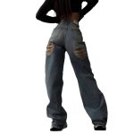 These retro-inspired jeans feature a high waist and straight leg cut, combining classic style with modern trends. Crafted with durable denim, they highlight a mop back design with distinctive ripped accents, adding an edgy and fashionable touch. Designed for a comfortable fit, these jeans blend vintage aesthetics with contemporary streetwear appeal, suitable for everyday casual wear.
