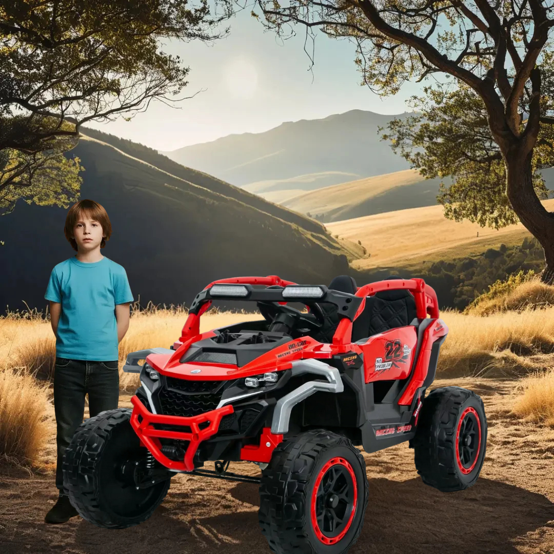 This 12V electric ride-on truck offers a two-seater UTV design equipped with front and rear shock suspension for enhanced comfort and stability. Suitable for children aged 3 to 6 years, it features remote control capability to enable parental supervision and safety. The vehicle includes integrated flashlights for visibility and a built-in music player to enhance the riding experience. Constructed with durable materials, it combines functionality and entertainment for young riders.