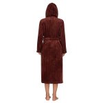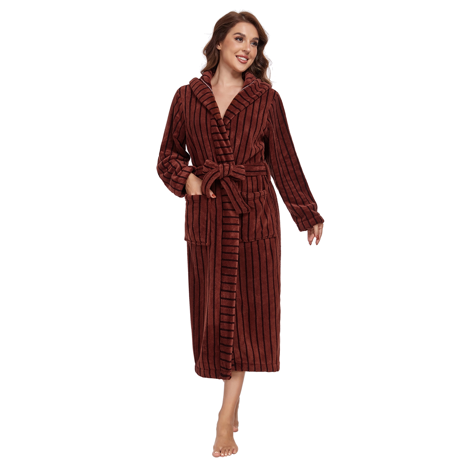 Soft and warm RONGTAI women’s extra long fleece bathrobe with hood and pockets, crafted from plush absorbent terry cloth for maximum comfort.