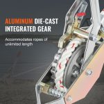 3/4 ton capacity rope puller featuring 30.48m rope, dual hooks, and heavy-duty ratchet system for efficient pulling and securing tasks.