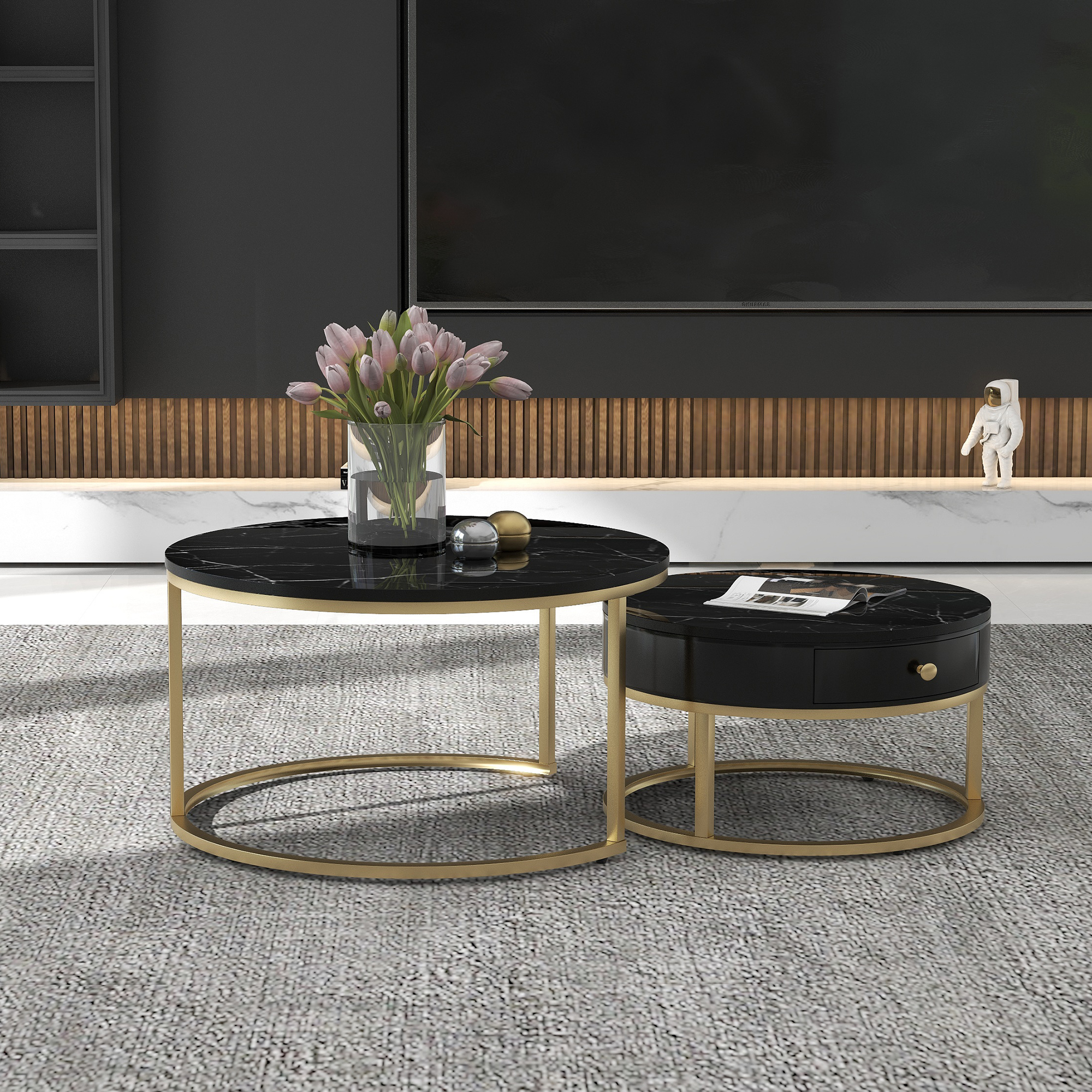 Set of 2 round nesting coffee tables with drawers, gold metal legs, and marble-patterned non-rock slab tops for versatile storage and style.