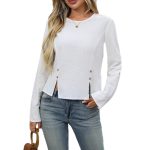 This top showcases a classic round neckline paired with decorative button accents, enhancing its minimalist design. Crafted for versatility, it includes a subtle side slit that adds ease of movement and a modern touch. The simple yet elegant style makes it suitable for various occasions, combining comfort with refined aesthetics.