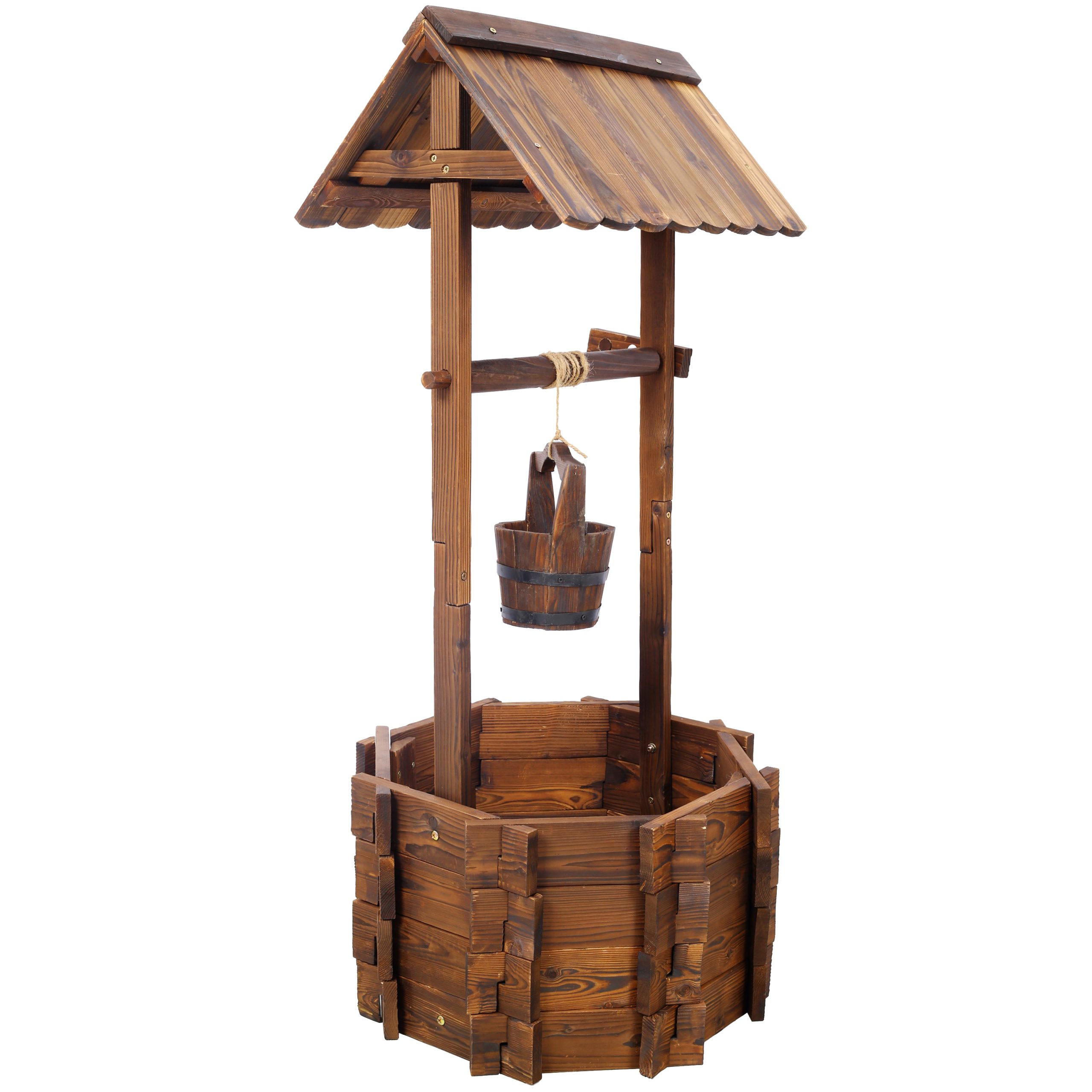 20-inch rustic wooden wishing well planter with hanging bucket, ideal for patio, garden, and yard outdoor decoration.