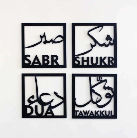 This set includes four Islamic wall art pieces, each featuring one of the key spiritual concepts: Sabr (Patience), Shukr (Gratitude), Dua (Supplication), and Tawakkul (Trust in God). Crafted with high-quality materials, these artworks provide elegant decor that serves both aesthetic and inspirational purposes. Perfect for enhancing the ambiance of homes, offices, or prayer spaces, the set promotes mindfulness and spiritual connection through beautifully designed calligraphy and motifs.