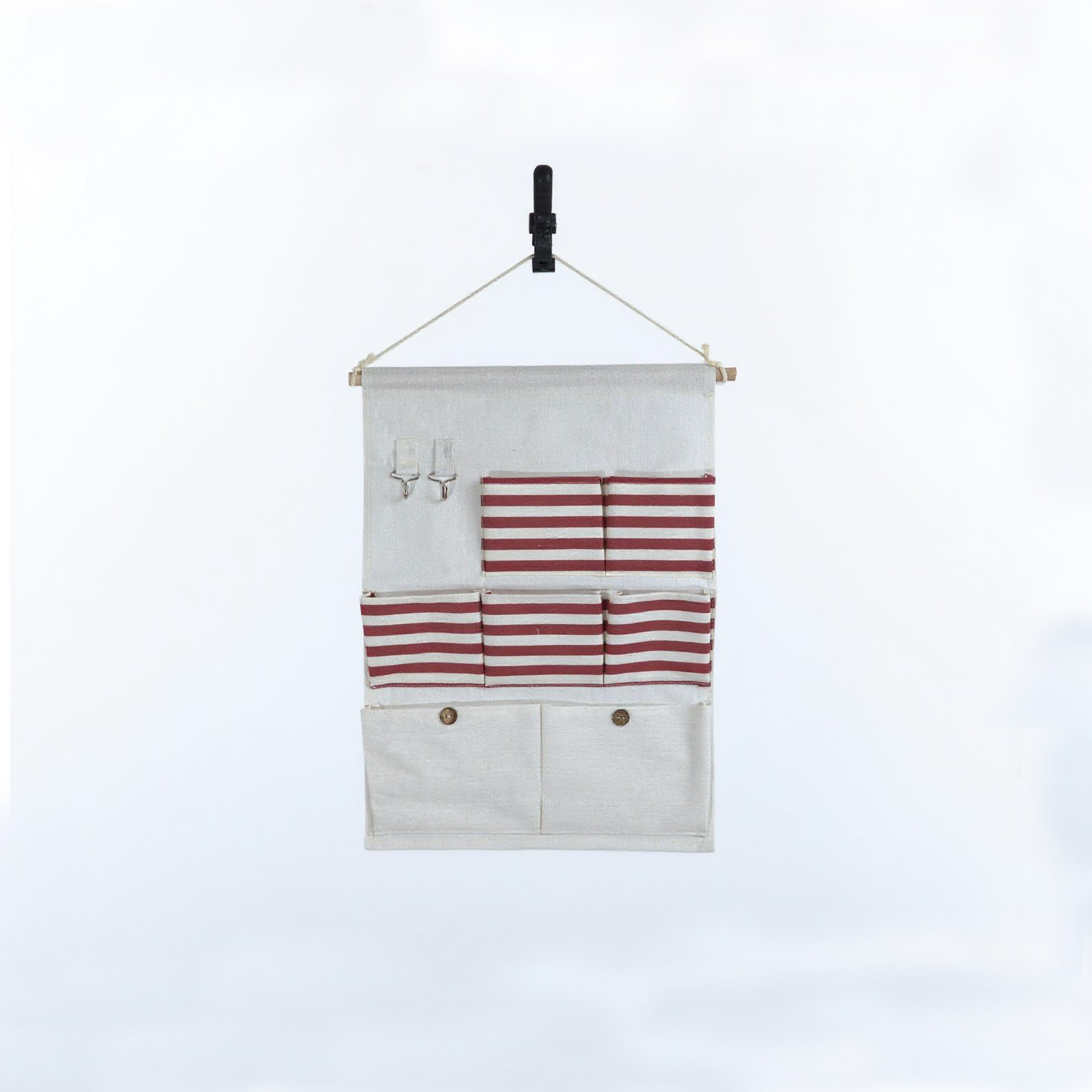 This red storage bag features seven individual pockets, allowing efficient organization of various items. Designed to hang conveniently, it helps maximize space while keeping belongings accessible and neatly arranged. Ideal for use in closets, dorms, or offices, this bag offers a practical and stylish storage solution.