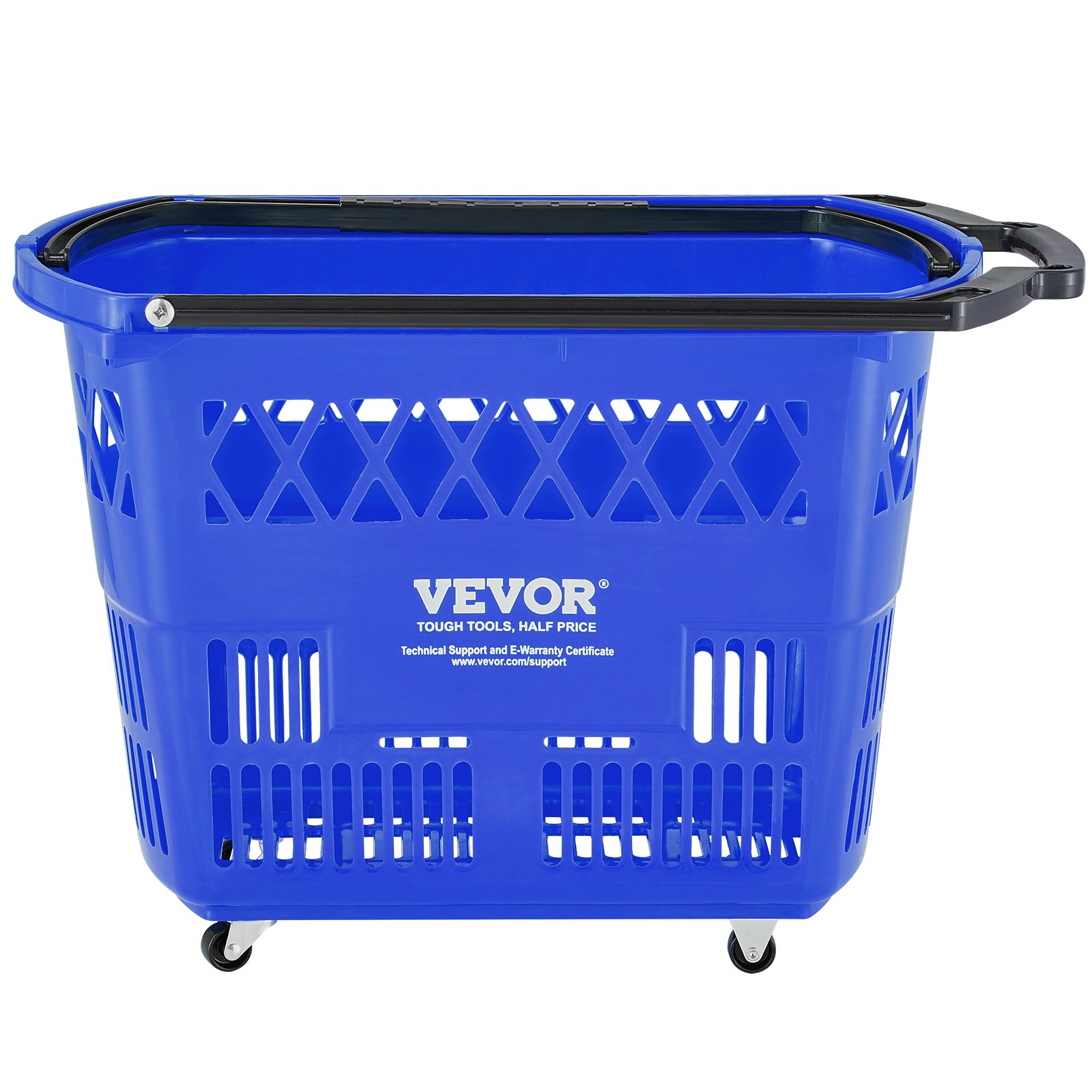 This set includes six 39-liter capacity shopping baskets made from durable plastic, equipped with ergonomic handles and smooth-rolling wheels for effortless mobility. Designed for convenience in supermarkets, retail stores, and grocery shopping, these large portable baskets provide ample space for goods while ensuring ease of transport. Their sturdy construction and practical design make them suitable for frequent use in commercial and retail environments. The vibrant blue color enhances visibility and style for organized shopping.