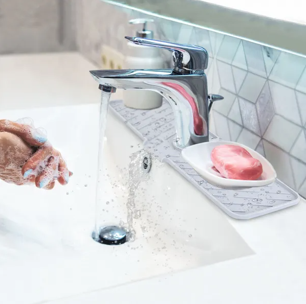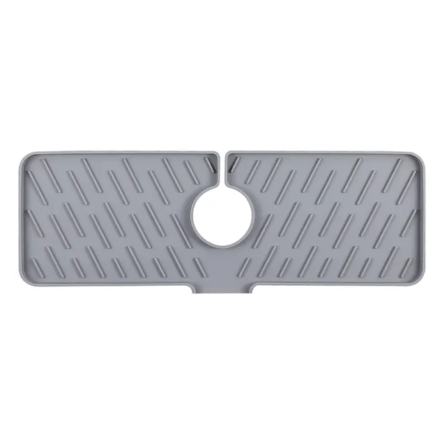 Durable silicone faucet mat protects kitchen sink from splashes and aids in drying with a reliable drain guard design.