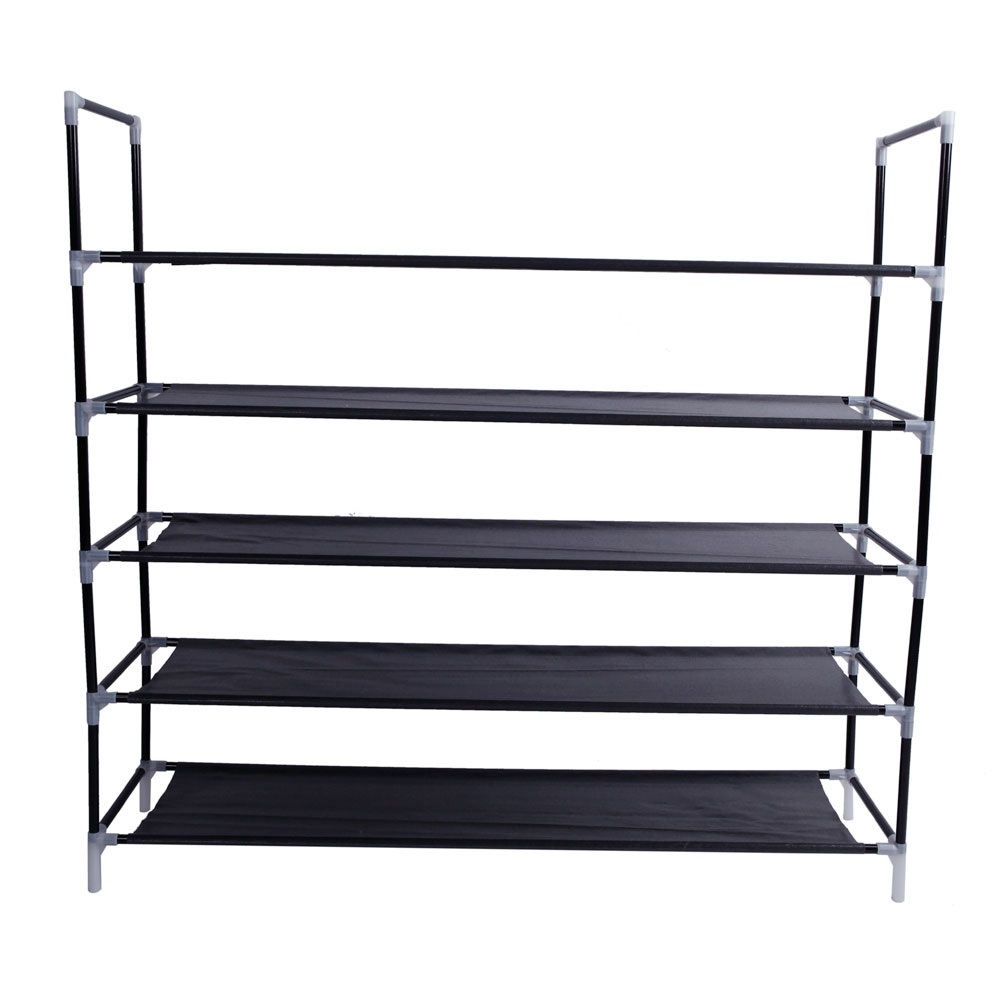 Durable 5-tier black shoe rack made from non-woven fabric, featuring a handle for easy portability and simple assembly.