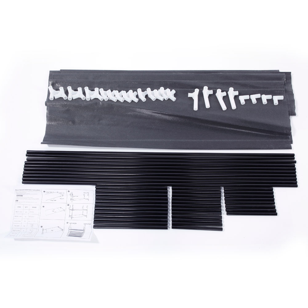 This black shoe rack organizer features five spacious tiers constructed from breathable, non-woven fabric. Designed for effortless assembly, it provides ample storage for multiple pairs of shoes while maintaining a lightweight structure. The integrated handle enhances portability, allowing easy repositioning within your home or office. Ideal for organizing footwear efficiently while keeping your space tidy and accessible.