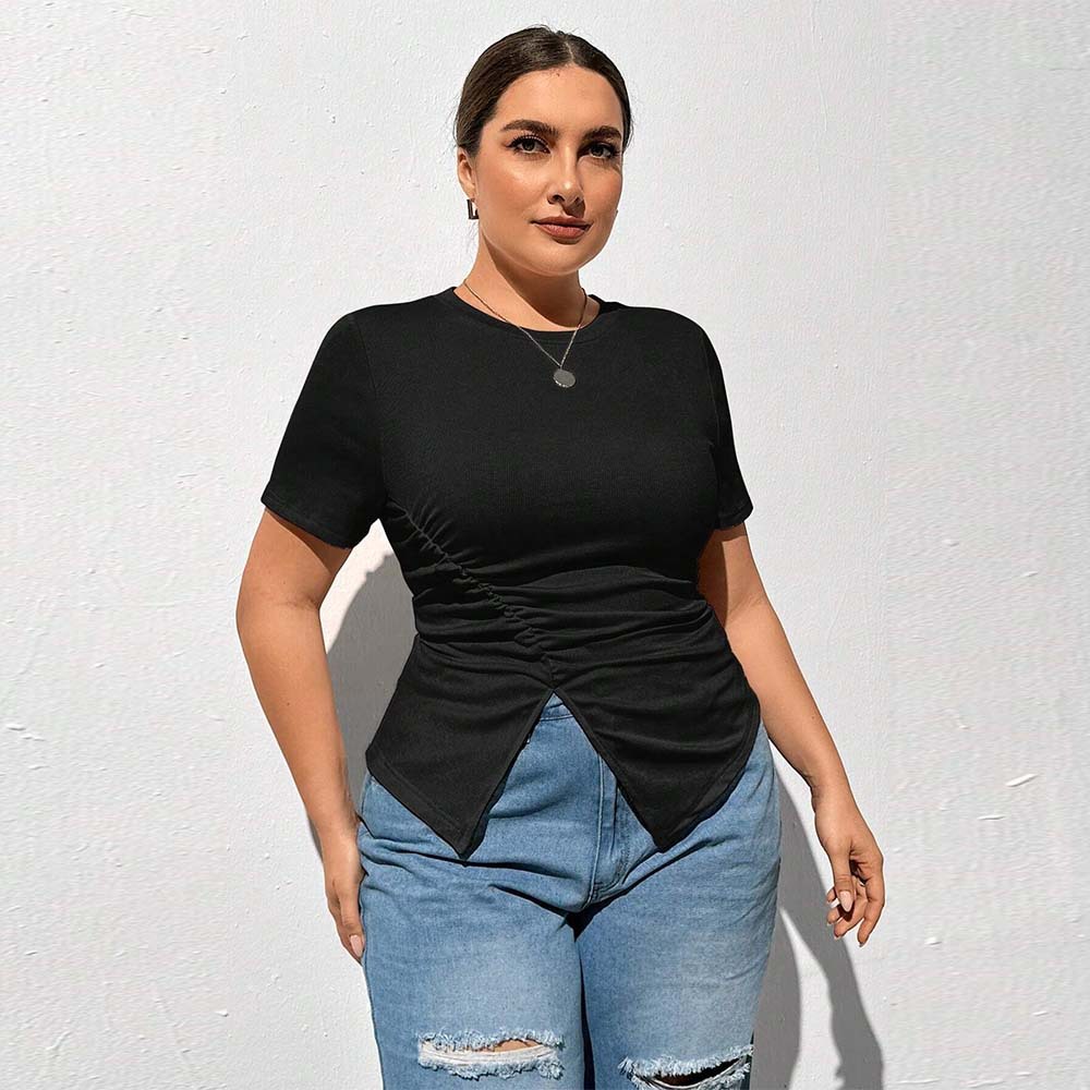Classic round neck solid color T-shirt with short sleeves and side slit detail, offering a comfortable and stylish everyday look.