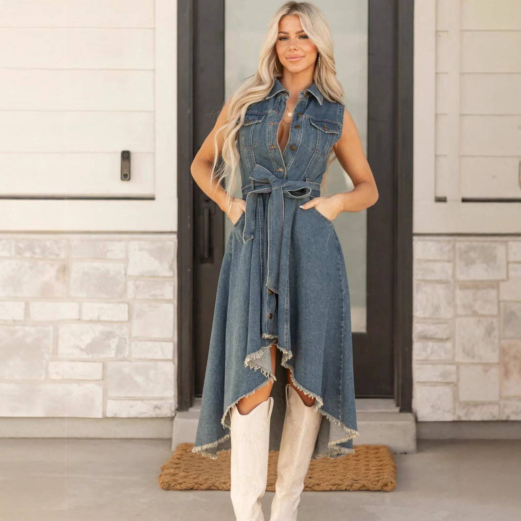 This sleeveless dress showcases a unique asymmetrical hemline paired with raw edge detailing, creating a striking and unconventional appearance. Crafted for individuality and elegance, the dress offers a flattering silhouette, ideal for diverse occasions. The design emphasizes personality through its distinctive cut, combining modern fashion with comfort.