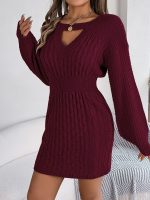 Stylish solid color cable knit bodycon sweater dress with hollow out lantern sleeves for a modern, comfortable fit.