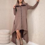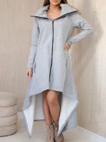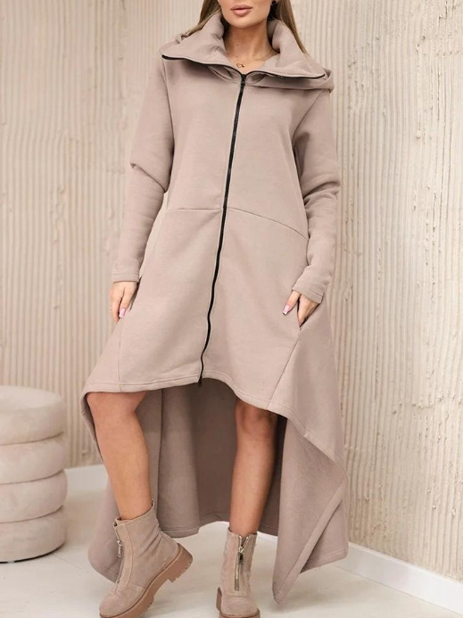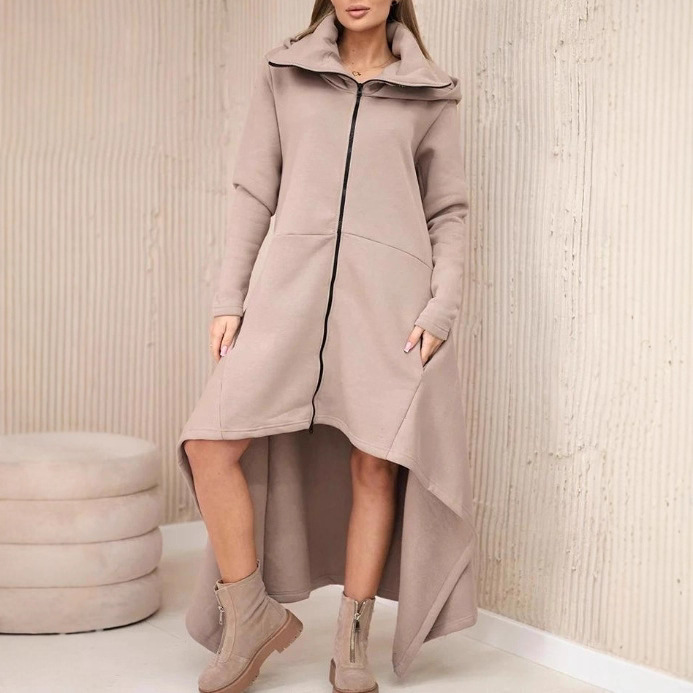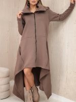 This solid color hoodie dress features a relaxed, loose fit designed for comfort and style. It includes a full-length zip front for easy wear and adjustment, along with an attached hood that adds casual functionality. The all-matching design allows effortless coordination with various casual outfits. Made from soft, breathable fabric, this skirt-style hoodie offers both warmth and ease of movement, perfect for everyday wear or leisure activities.