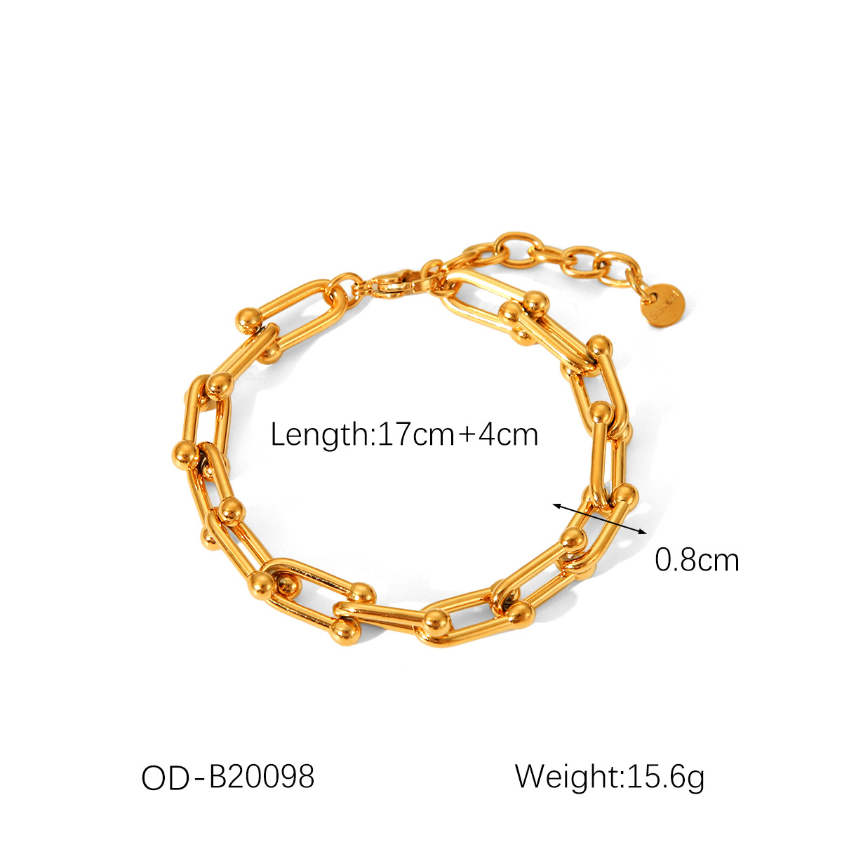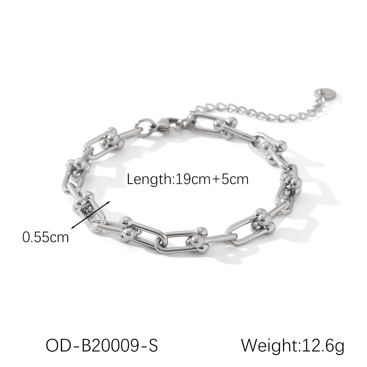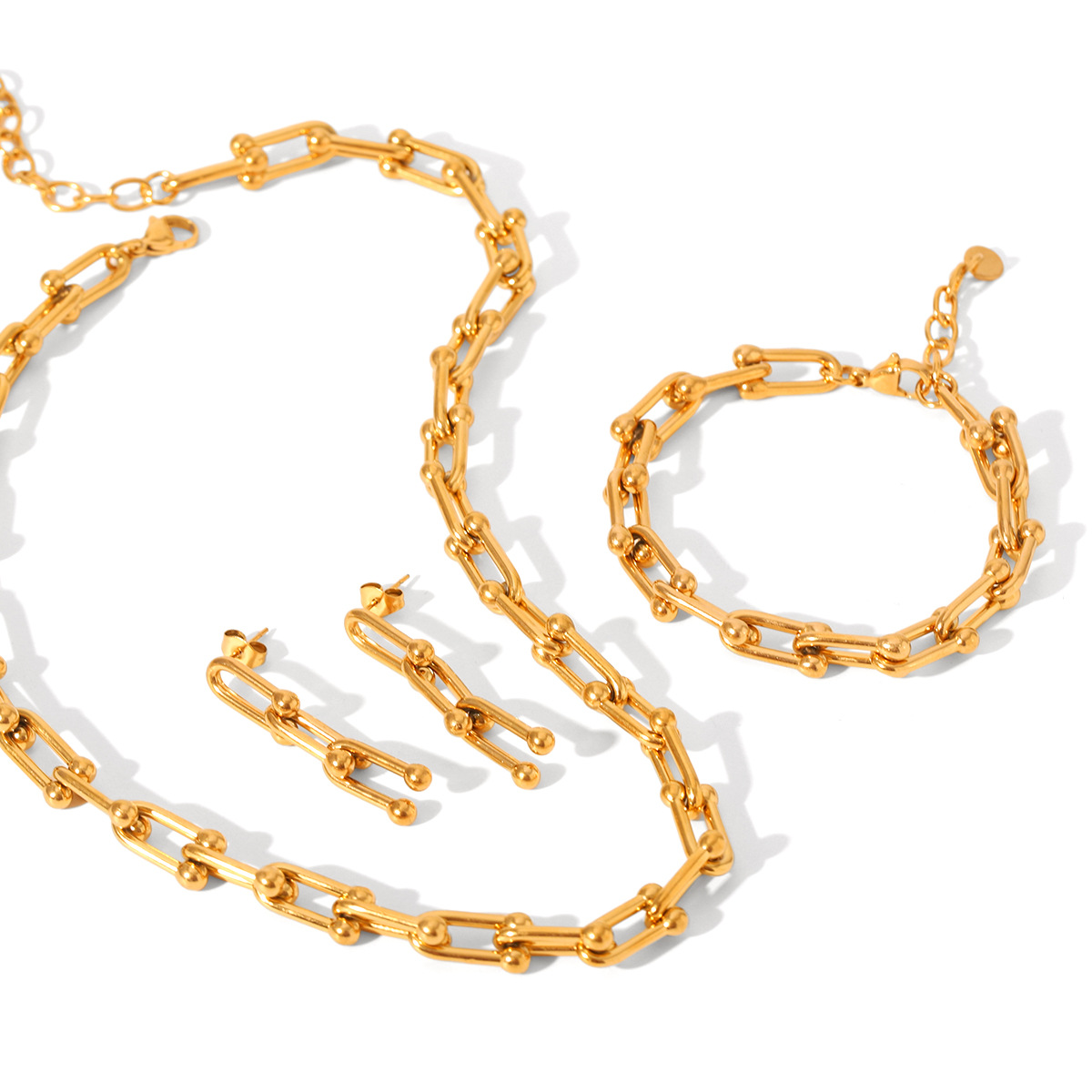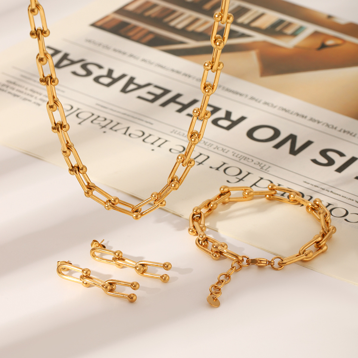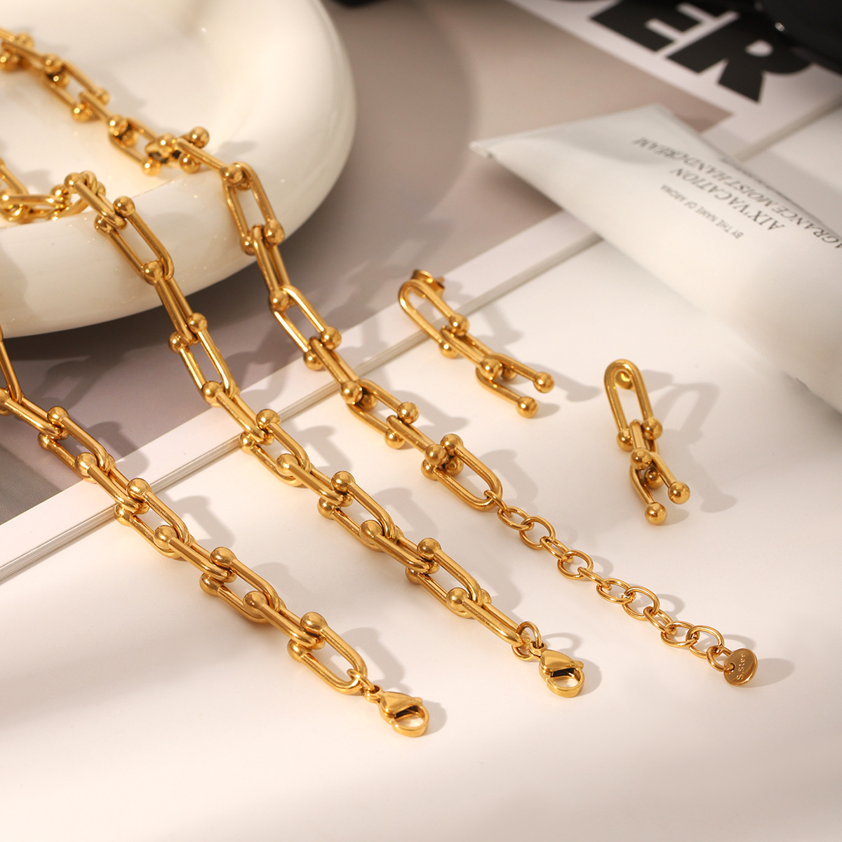 Elegant stainless steel jewelry set featuring a horseshoe necklace, chain bracelet, and matching earrings for versatile stylish wear.