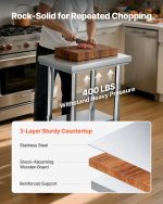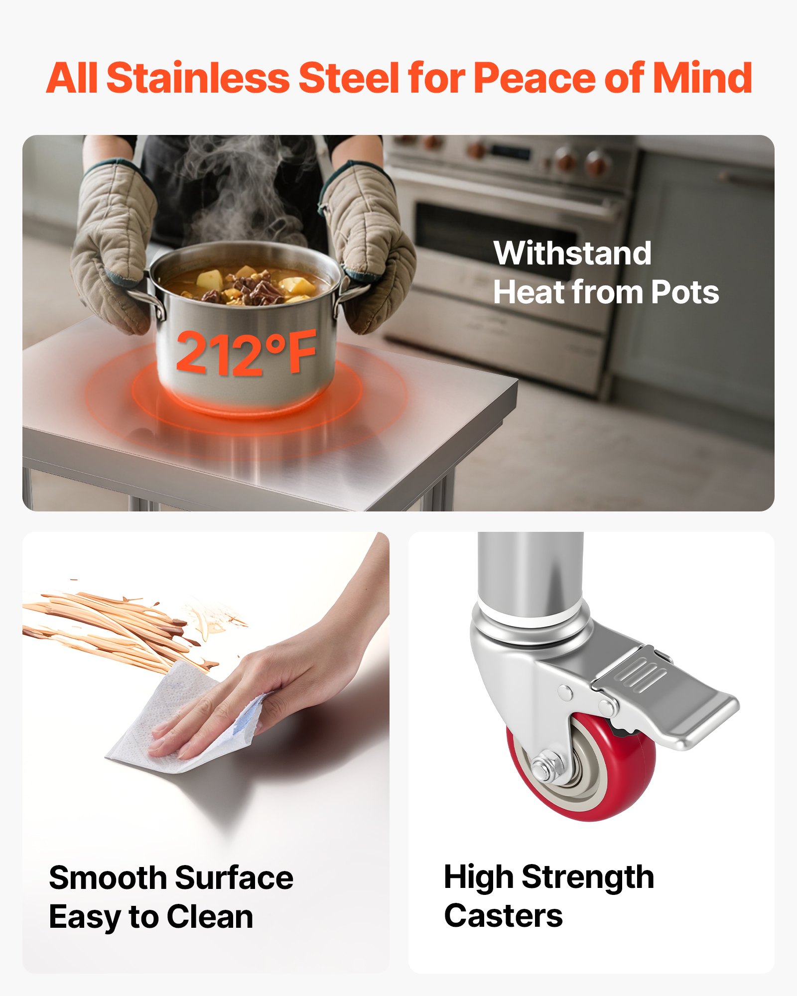 Stable and Durable: The top shelf holds up to 400 lbs, the bottom 300 lbs, providing ample storage for your supplies. With 4 swivel casters (2 with brakes), the food prep worktable stays stable and moves easily wherever you need it