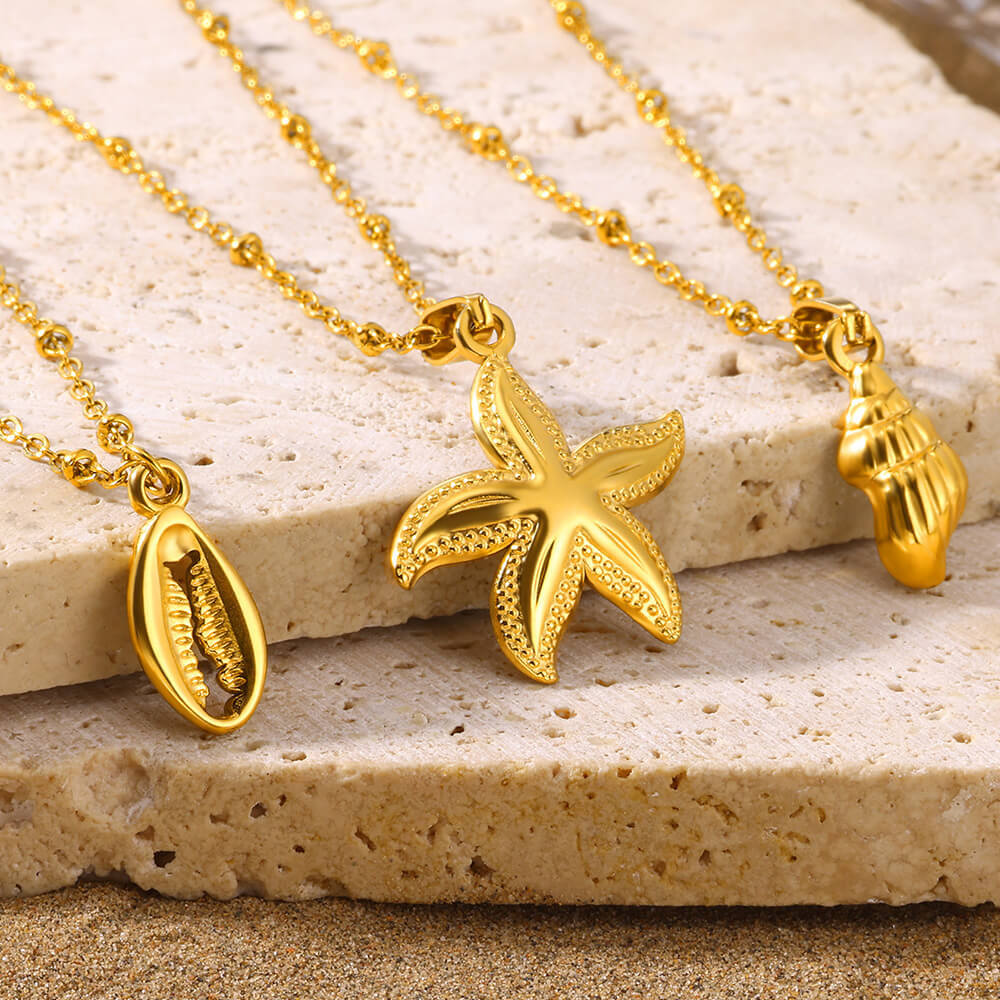 Elegant starfish and shell necklace crafted from durable stainless steel, perfect for beach lovers and casual wear.