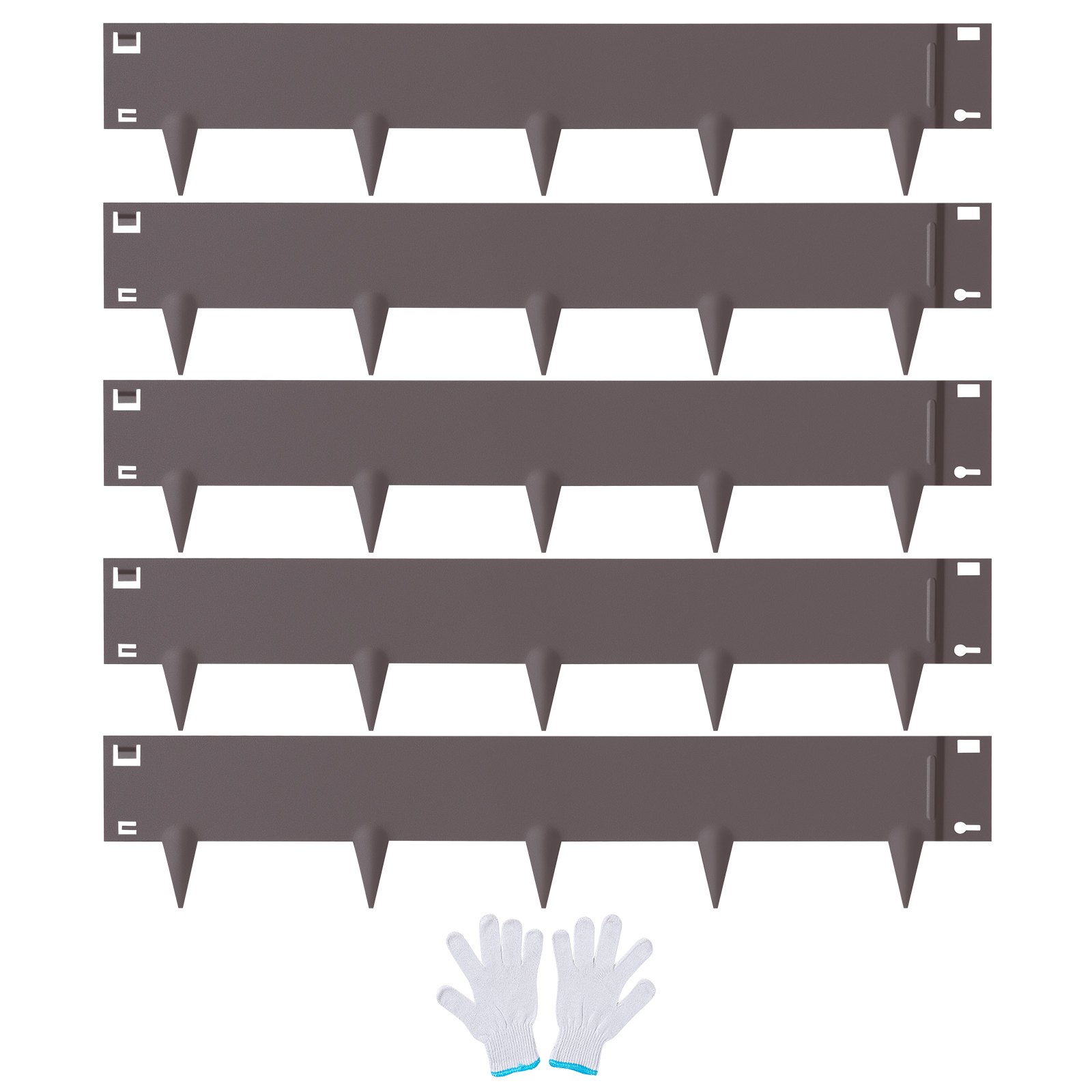 This set includes five steel landscape edging strips, each measuring 39 inches in length and 5 inches in height. Constructed from sturdy metal with a brown finish, these bendable borders are designed to define and enhance garden beds, lawns, and yard perimeters. The metal edging features integrated hammer-in spikes, each with a 3.15-inch height, ensuring secure installation and stable placement in various soil types. The flexible design allows for easy customization to fit curves or straight sections, providing a neat, professional boundary for landscaping projects.