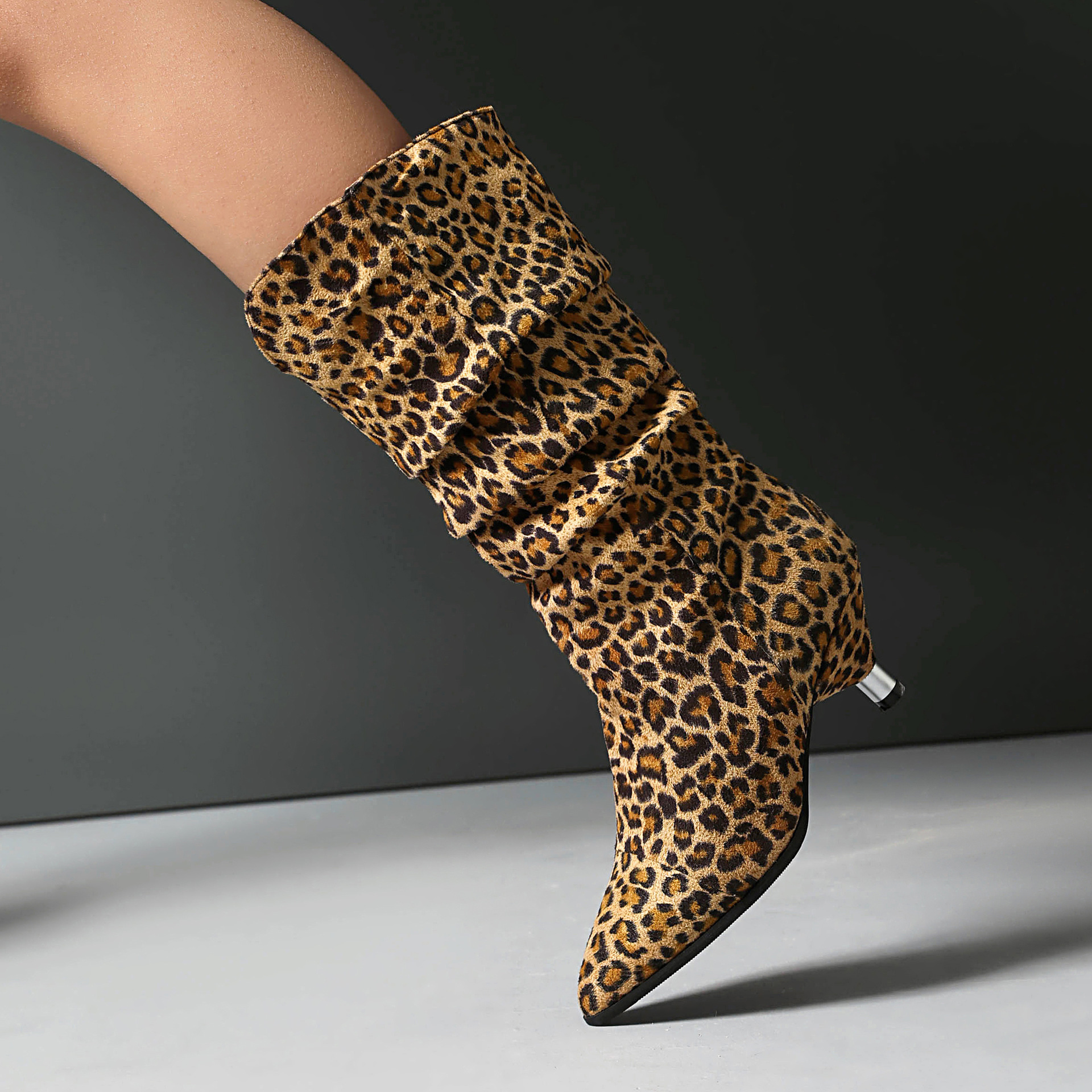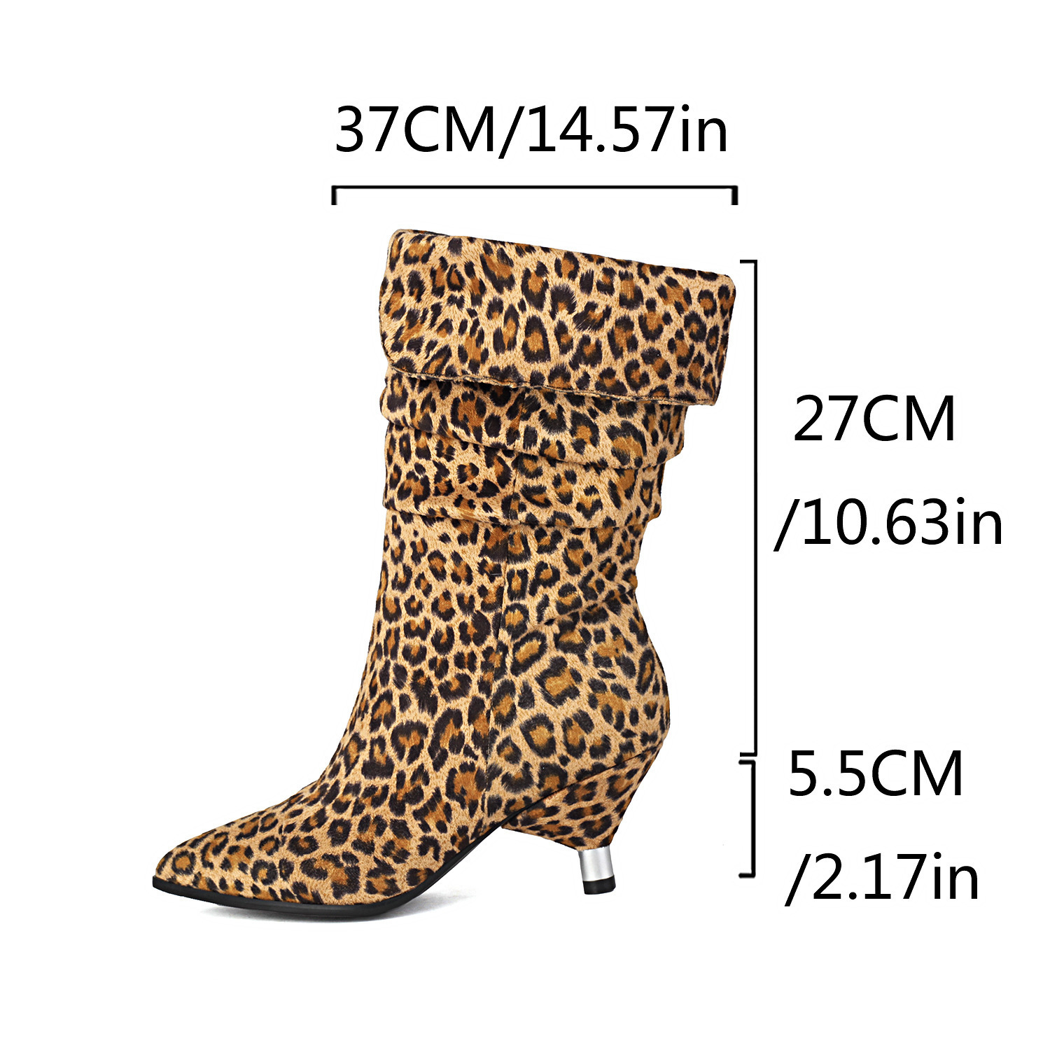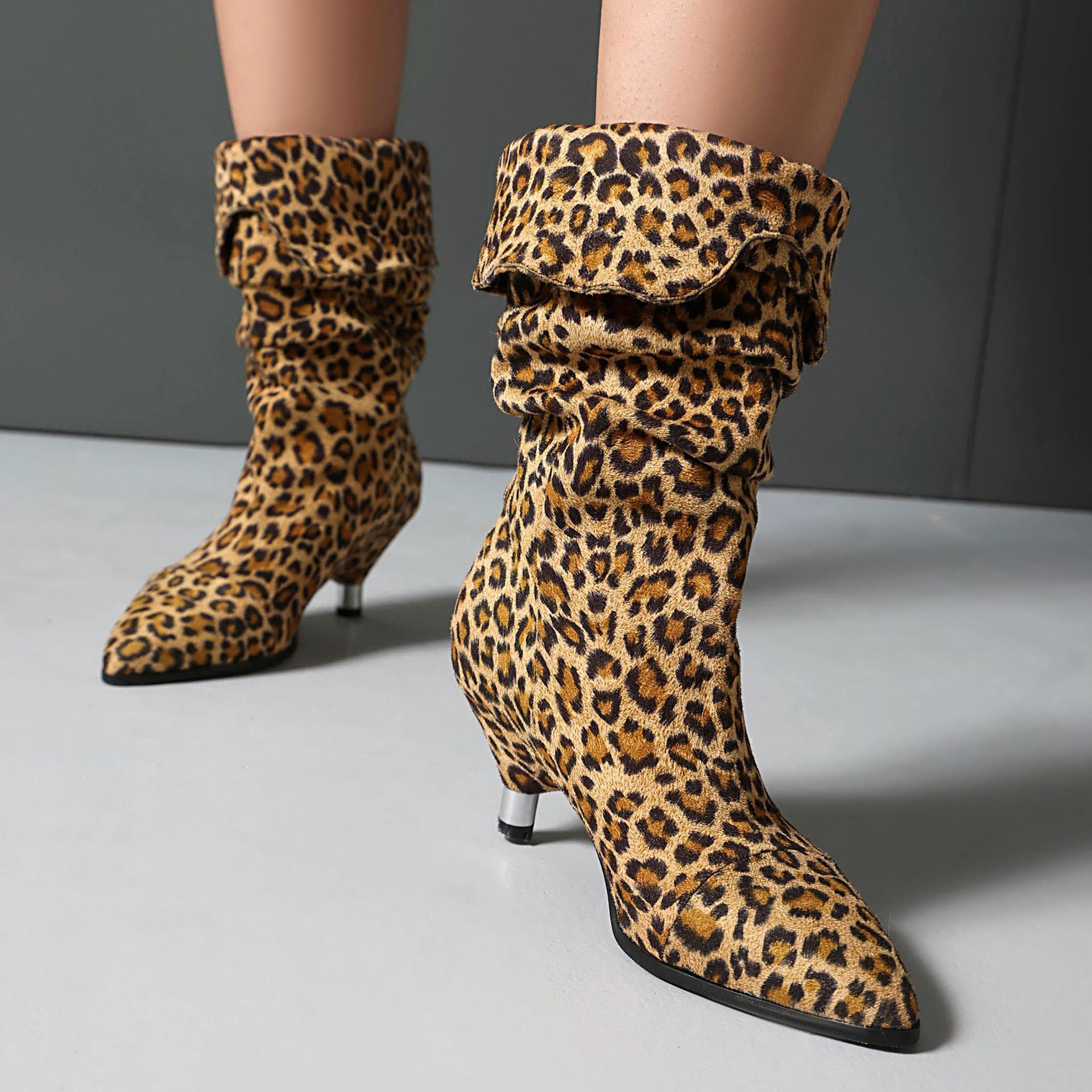 Stylish leopard-print ankle boots featuring a pointed toe, stiletto heel, and distinctive turned-over cuffs for elegant fashion wear.
