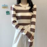 Slim-fit striped knitted long sleeve top for women, perfect for layering and casual wear.