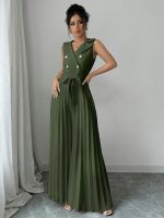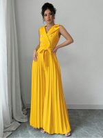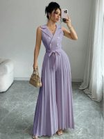This stylish jumpsuit combines a classic suit collar with a charming bow tie detail at the neckline. Designed with a belted waist to accentuate the silhouette, it features a pleated pattern that adds texture and movement. Crafted for a tailored yet comfortable fit, this versatile jumpsuit is ideal for both formal and semi-formal occasions.