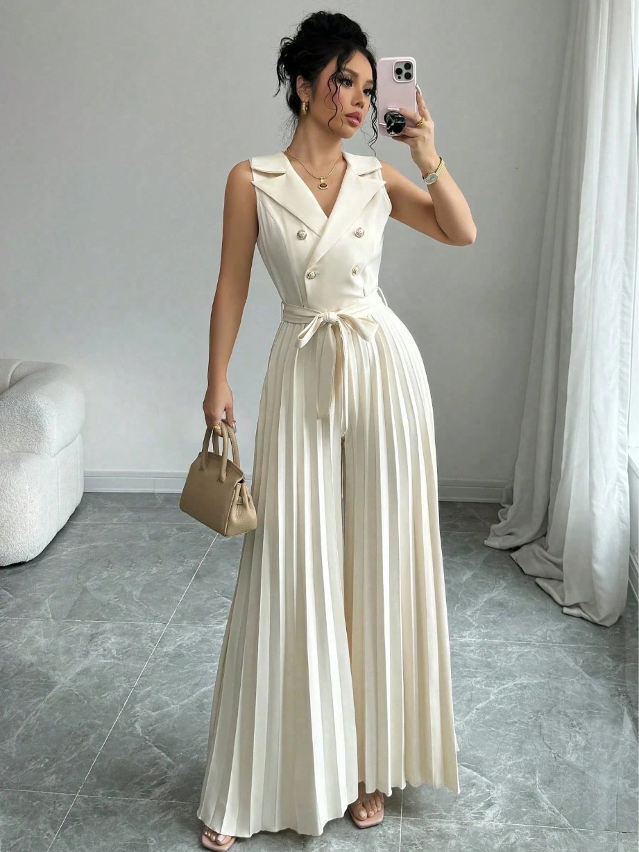 Elegant jumpsuit featuring a suit collar, bow tie, belted waist, and pleated design for a sophisticated style.