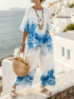 This summer ensemble includes a lightweight, loose-fitting batwing sleeve T-shirt with a stylish striped pattern, complemented by solid-colored straight-leg pants. Crafted for breathability and ease of movement, the set offers a relaxed fit ideal for warm weather. The combination of the casual striped top and the clean-lined pants creates a balanced look suitable for various occasions, ensuring both comfort and understated elegance.