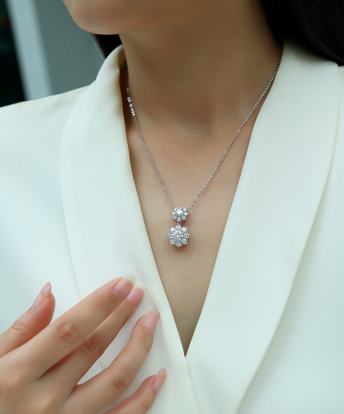 Elegant Sunshine Flower pendant set featuring top-quality Moissanite, S925 silver, and platinum plating, testable with a diamond pen.