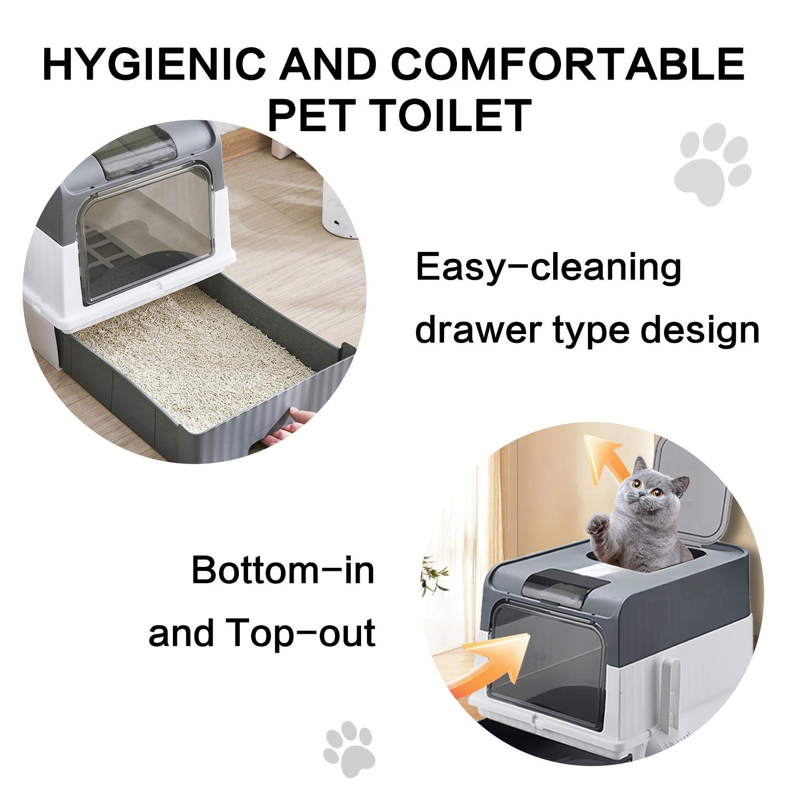 This super large capacity cat litter box is designed for convenience and hygiene. Featuring a pull-out tray, it allows effortless cleaning without mess. The litter box is constructed to be leak-proof and resistant to odors, ensuring a fresh environment for your pet. Its durable design prevents leakage and promotes comfort, making it suitable for cats of various sizes. The easy-to-clean structure simplifies maintenance, providing a practical and reliable pet toilet solution.
