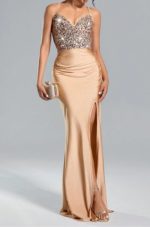 This suspended backless maxi skirt dress features a high-waisted design complemented by intricate sequin patchwork. The long skirt includes a stylish high slit, enhancing movement and adding a contemporary edge. Crafted for summer and graduation events, it combines sophistication with comfort, presenting a flattering silhouette for women seeking an elegant outfit for special occasions.
