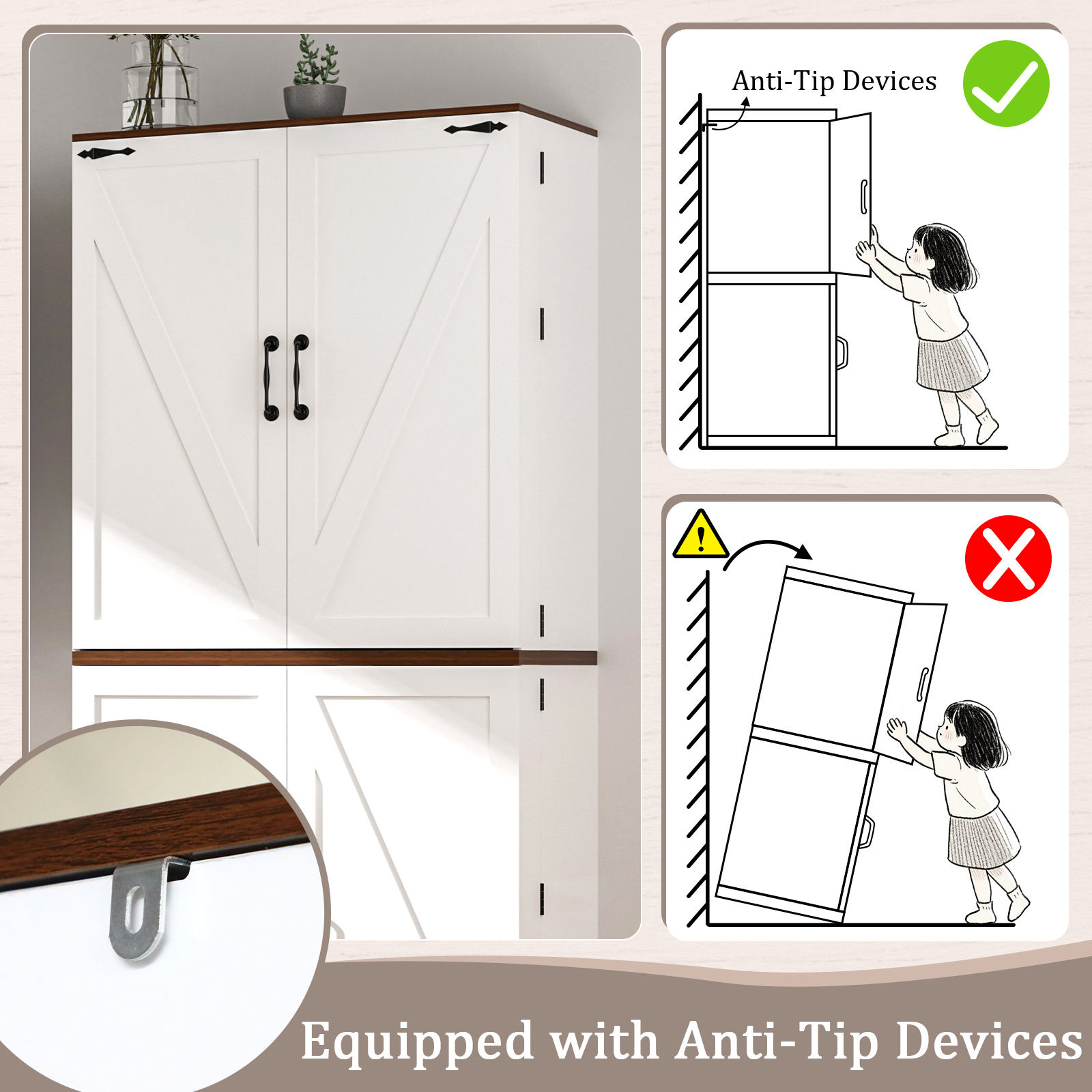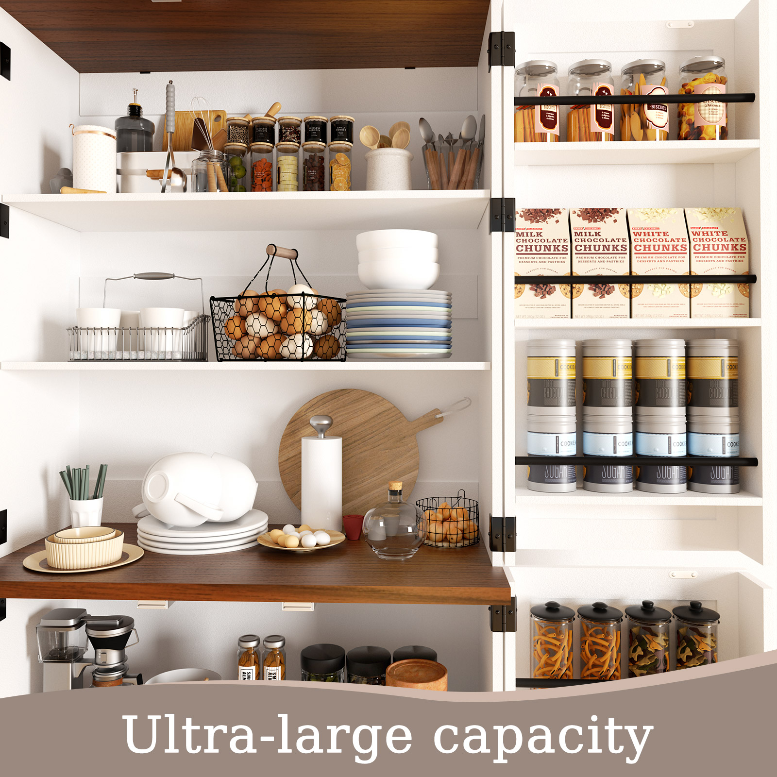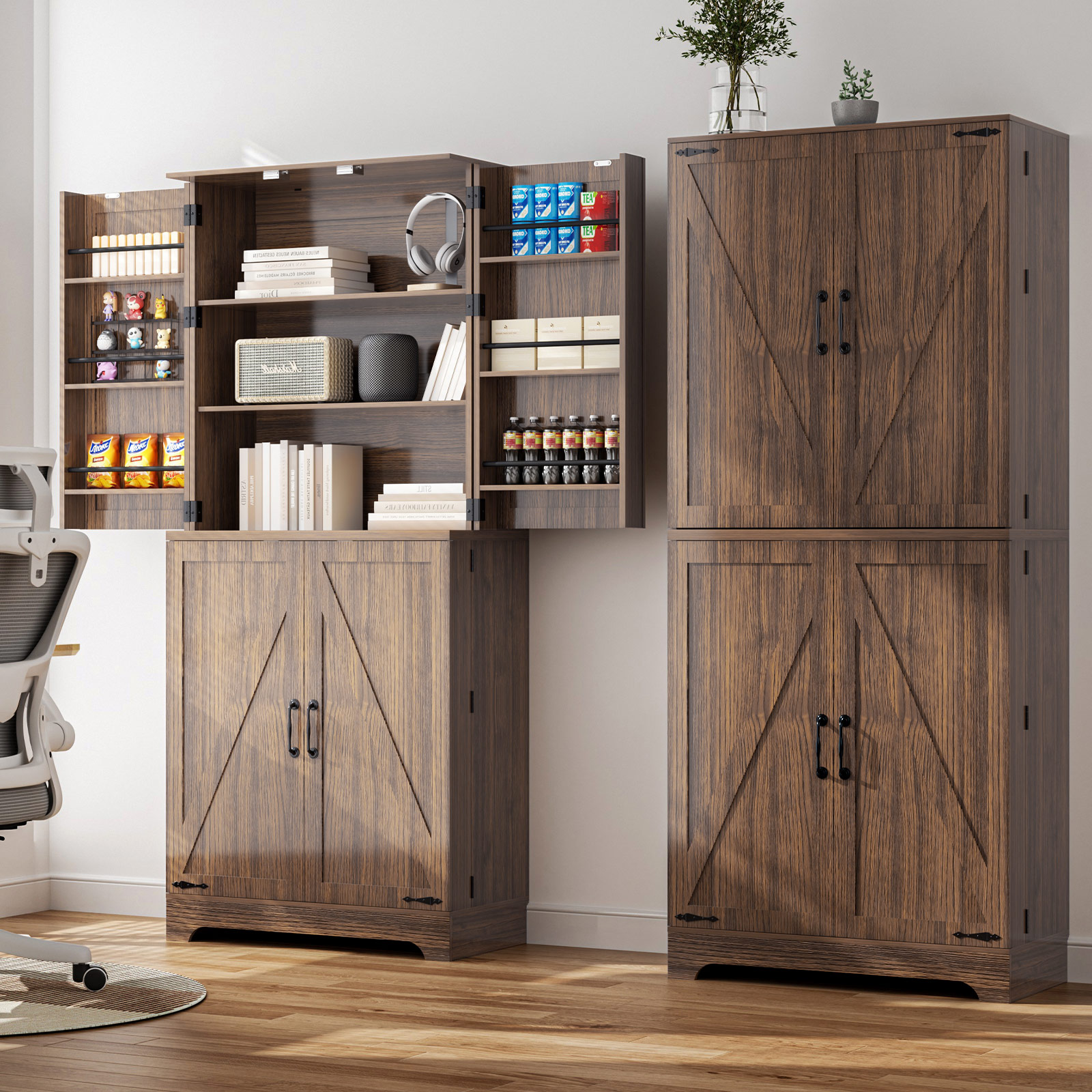 Spacious 5-tier wooden kitchen pantry cabinet with 4 barn doors, adjustable shelves, and 12 door racks for organized storage.