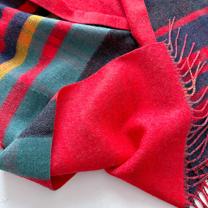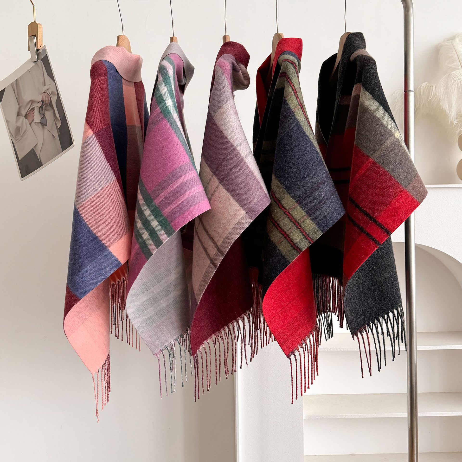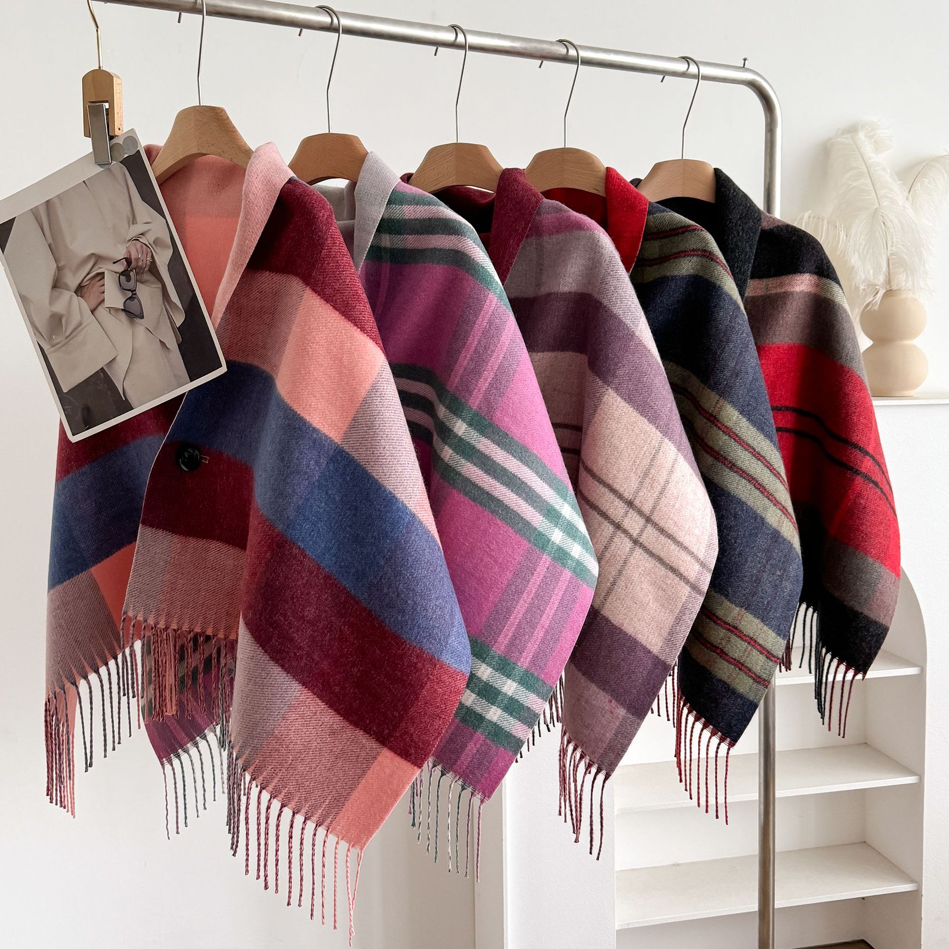 Soft double-sided wool cloak with tassel accents, versatile as a shawl or scarf for warmth and style in colder weather.