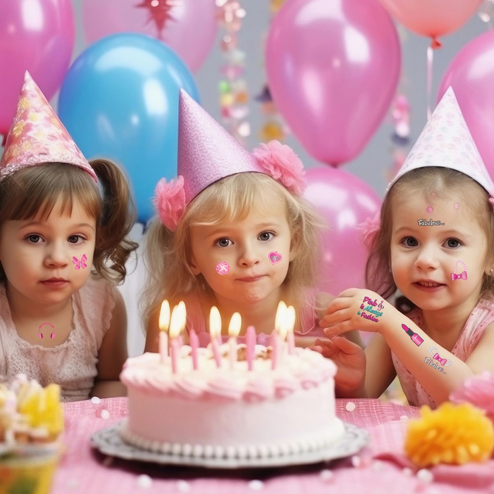 This set features temporary princess-themed kiss tattoos designed for children and women, ideal for birthday celebrations and party favors. The tattoos are easy to apply and remove, providing a safe, non-permanent way to enhance festive looks. Included is a compact makeup case for convenient storage and organization of beauty essentials, complementing the playful and elegant vibe of the tattoos. Suitable for kids’ birthday parties, themed events, and casual wear, these accessories combine fun and style in one package.