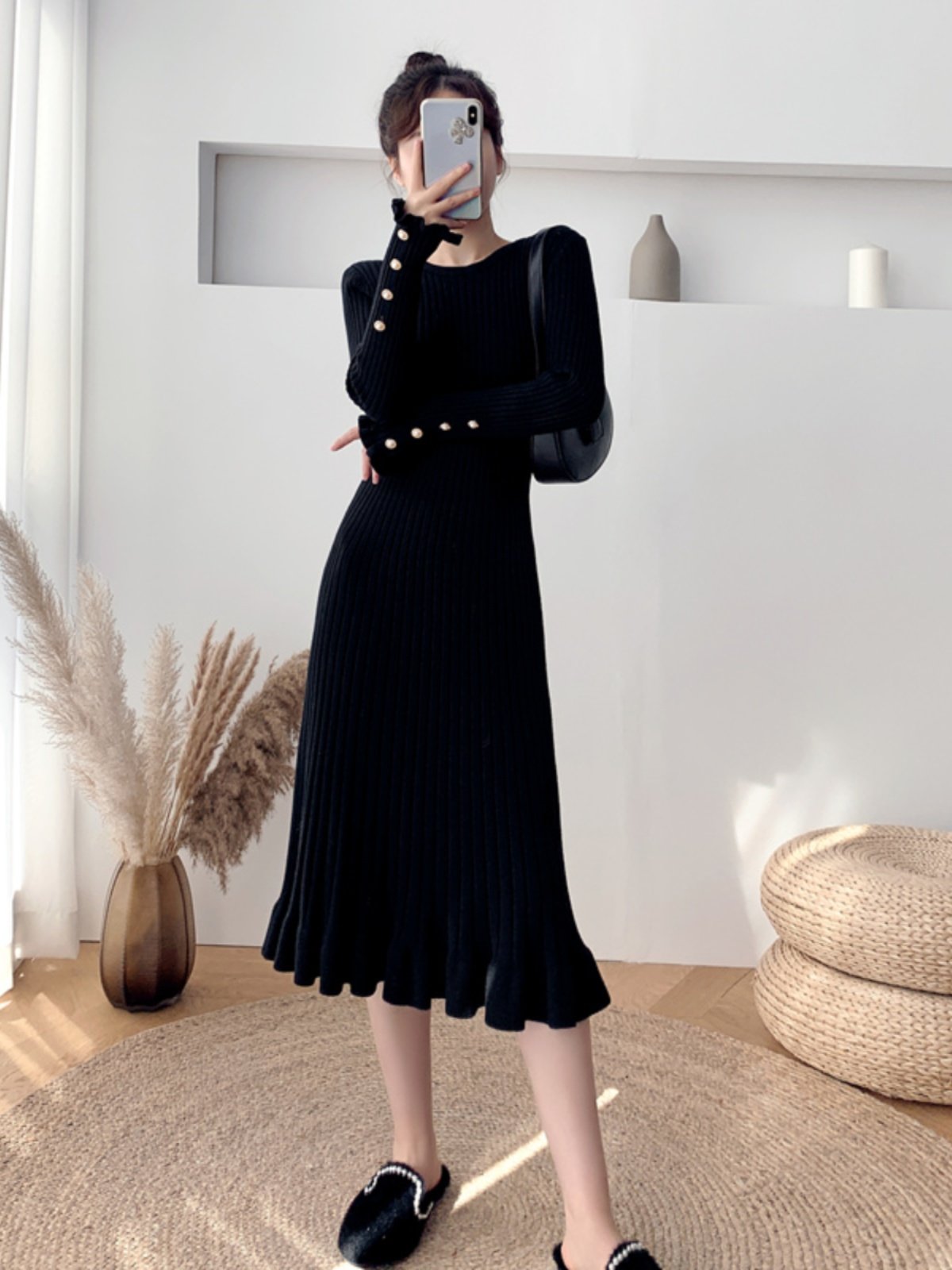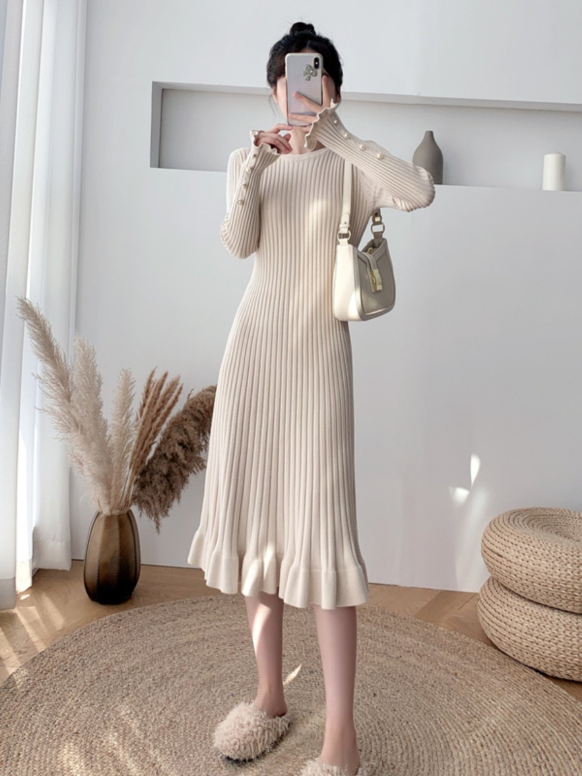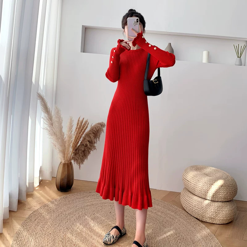 Cozy and stylish thickened mid-length knitted dress with a loose fit and crew neckline, perfect for warmth and comfort.