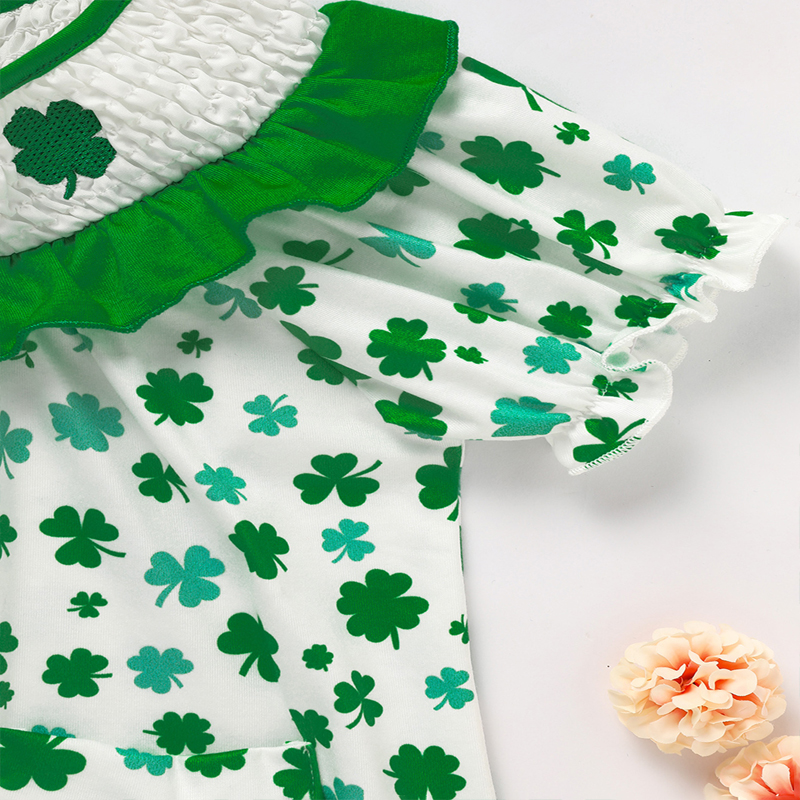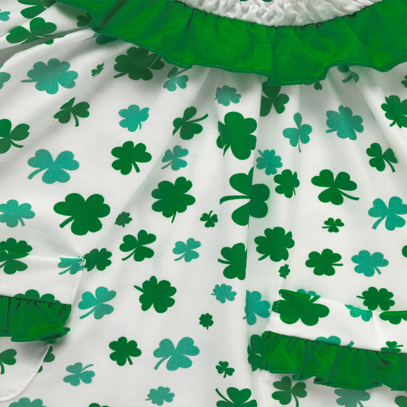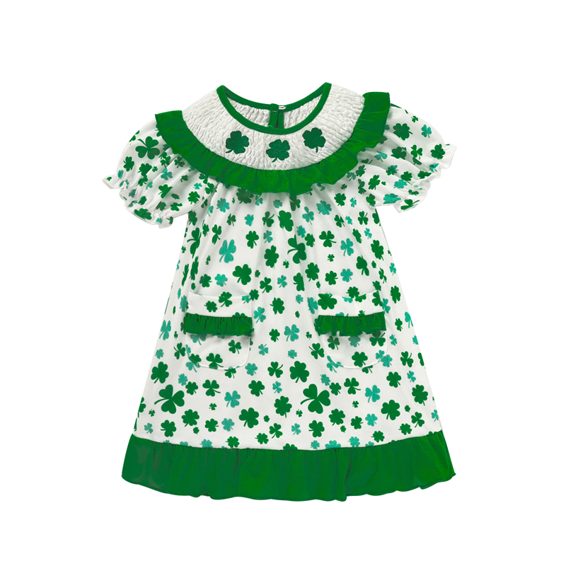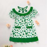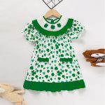 Spring toddler dress featuring clover print, doll collar, bubble sleeves, pockets, and back buttons for easy wear and comfort.