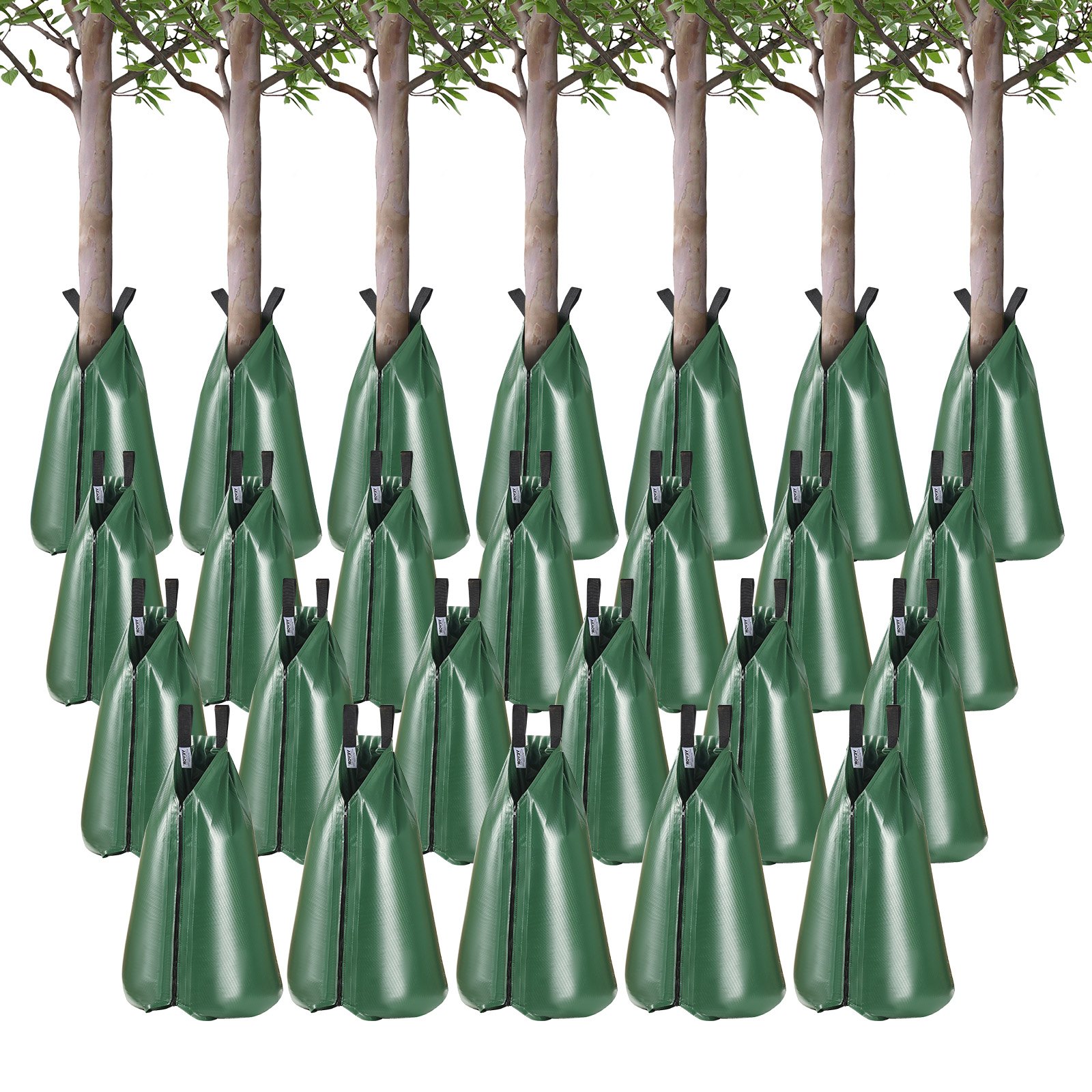 This set includes 25 durable tree watering bags, each with a 20-gallon capacity, designed to provide slow-release irrigation over 5 to 9 hours. The refillable bags feature a secure zipper closure for easy filling and durability. Engineered to deliver water directly to the root zone, these drip irrigation bags promote deep root growth and improve tree establishment. Suitable for newly planted trees, the system ensures efficient water usage and consistent moisture delivery to enhance plant health.