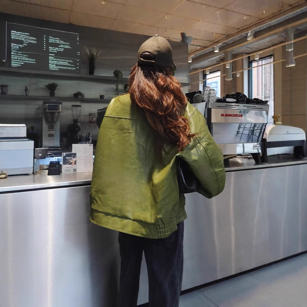 Stylish women’s green leather short coat featuring a turn-down collar, offering a sophisticated and versatile outerwear option.