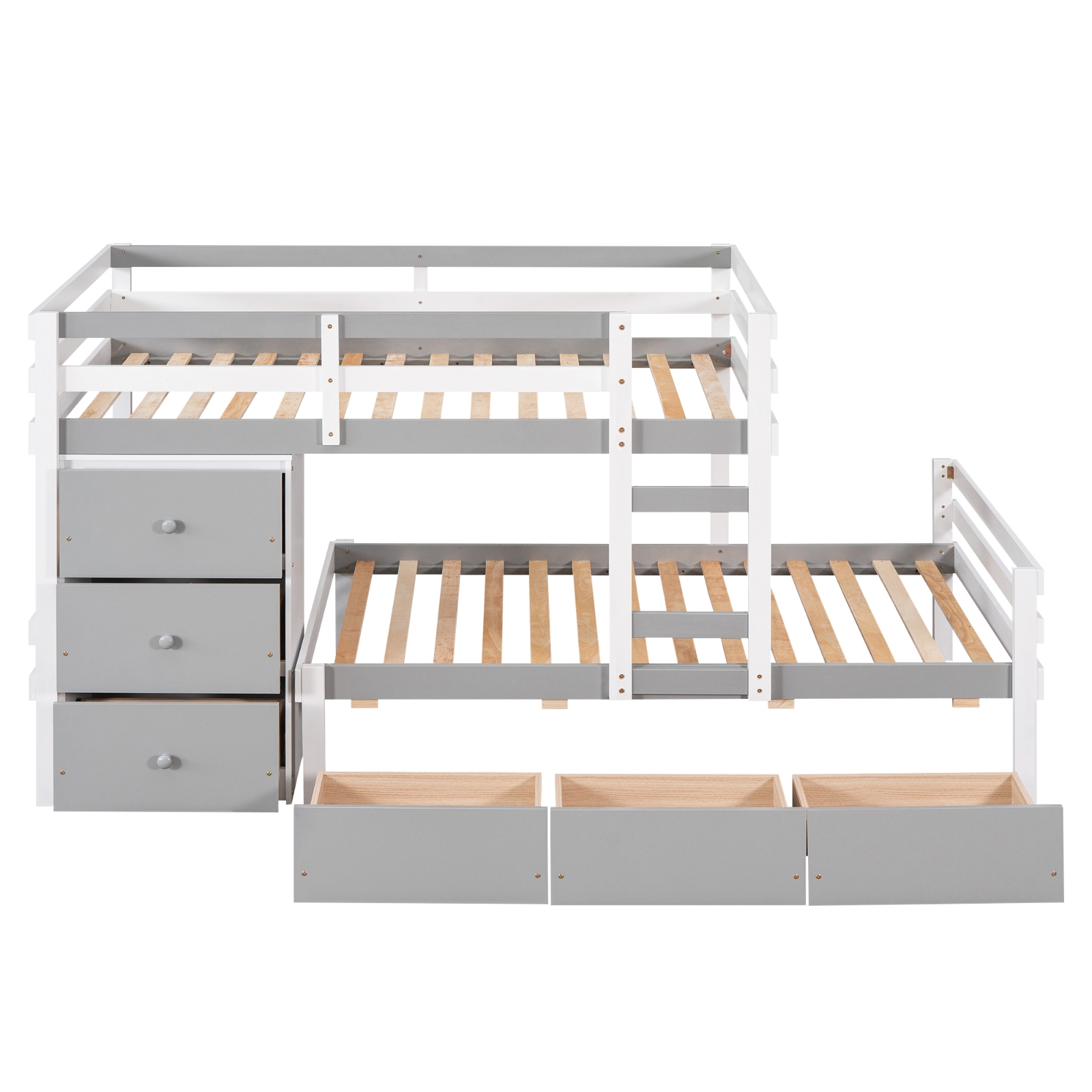 Sturdy gray twin over twin loft bunk bed featuring built-in drawers and ladder for optimized space and storage.