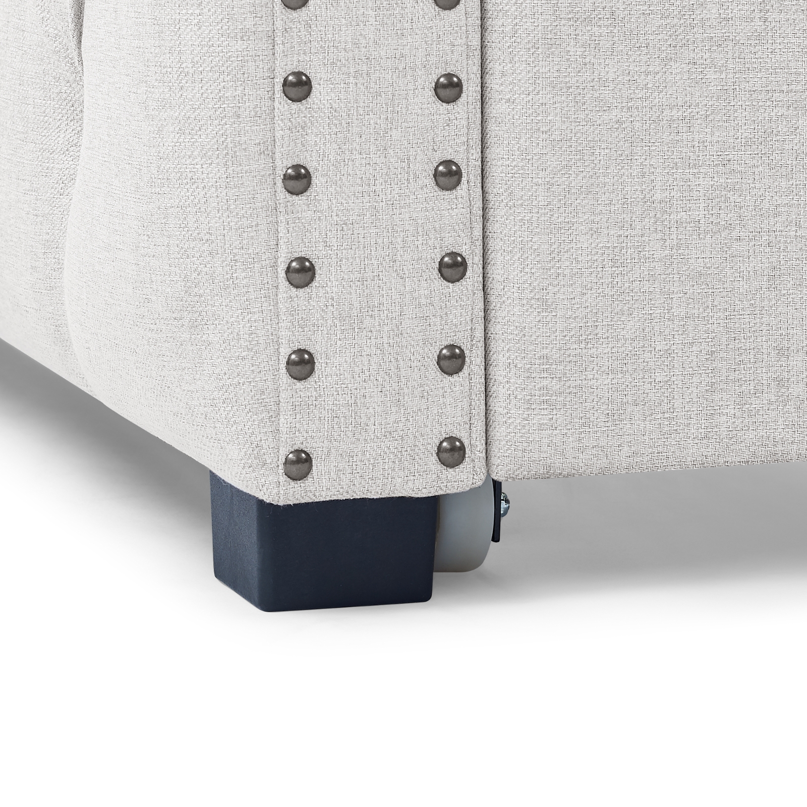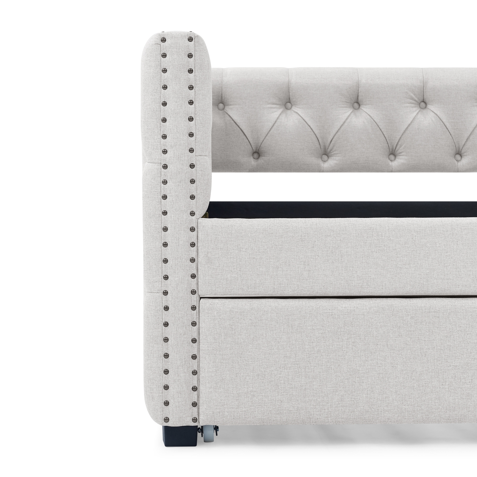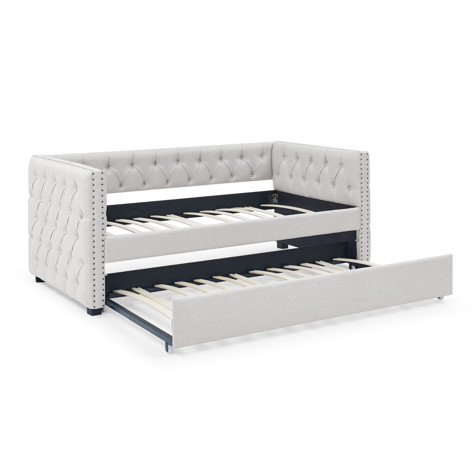 This upholstered tufted daybed offers a sophisticated seating and sleeping solution, featuring square arms and button tufting for a classic look. The frame is enhanced with copper nailhead trim, adding a refined metallic accent. Equipped with a convenient trundle bed, it maximizes space by providing an extra sleeping area that can be tucked away when not in use. Ideal for guest rooms or multi-purpose spaces, this piece combines style and functionality seamlessly.