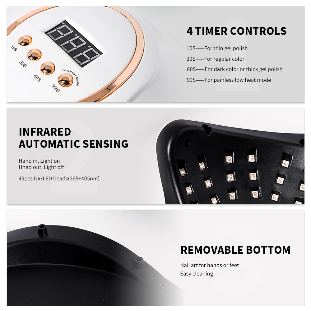 Efficient UV LED nail dryer with 45 beads, 4 timer settings, automatic sensor, and LCD display for quick gel polish curing.