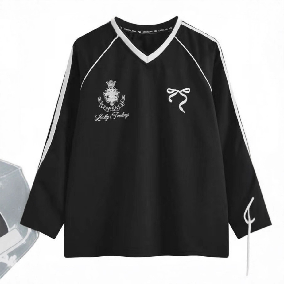 This V-neck T-shirt features an elegant butterfly design and long sleeves, crafted with a loose fit for optimal comfort and ease of movement. Made from soft, breathable material, it combines sports jersey style with casual wear appeal, suitable for athletic or everyday use. The tie detail at the neckline adds a distinctive touch to its classic design, enhancing both practicality and visual interest.
