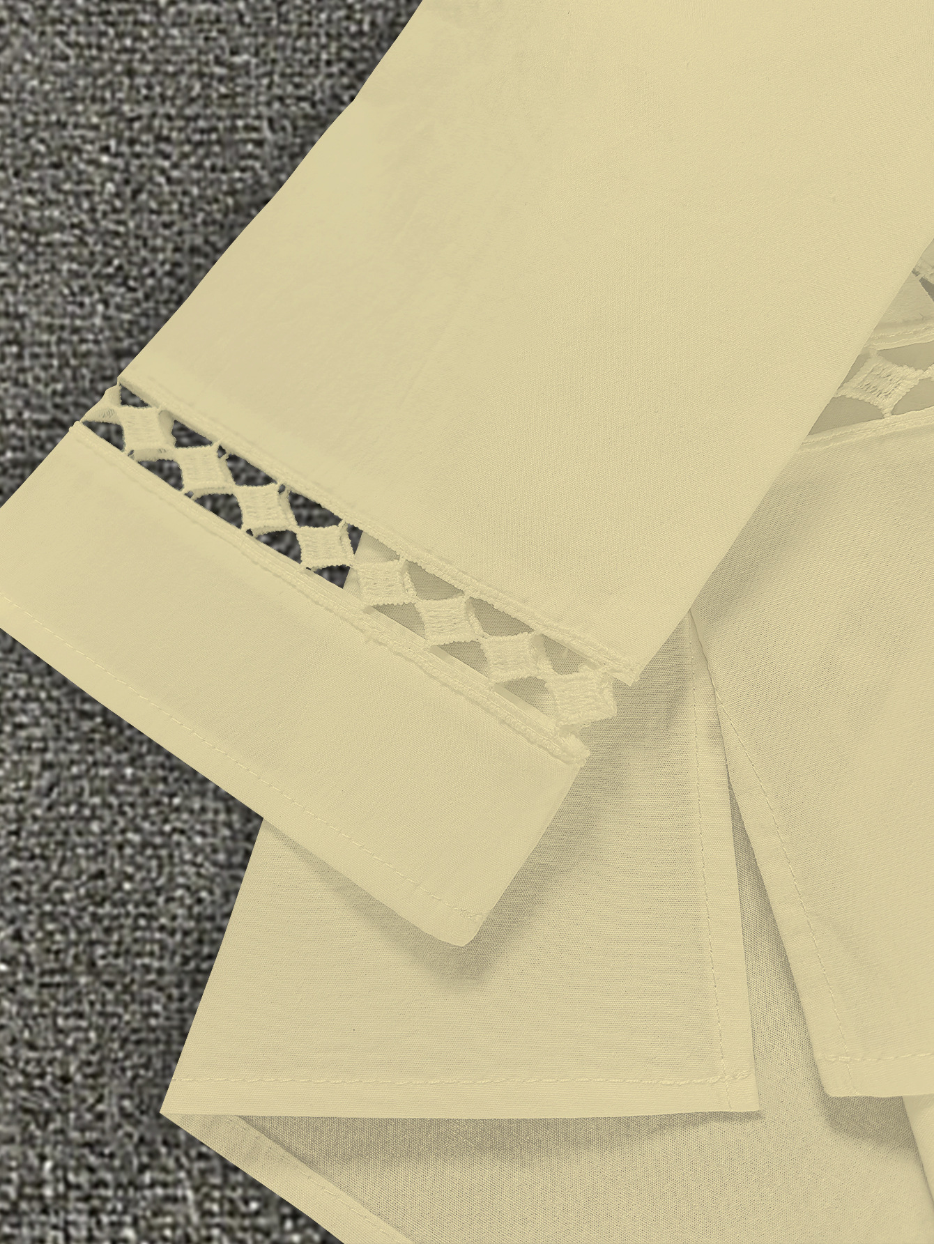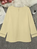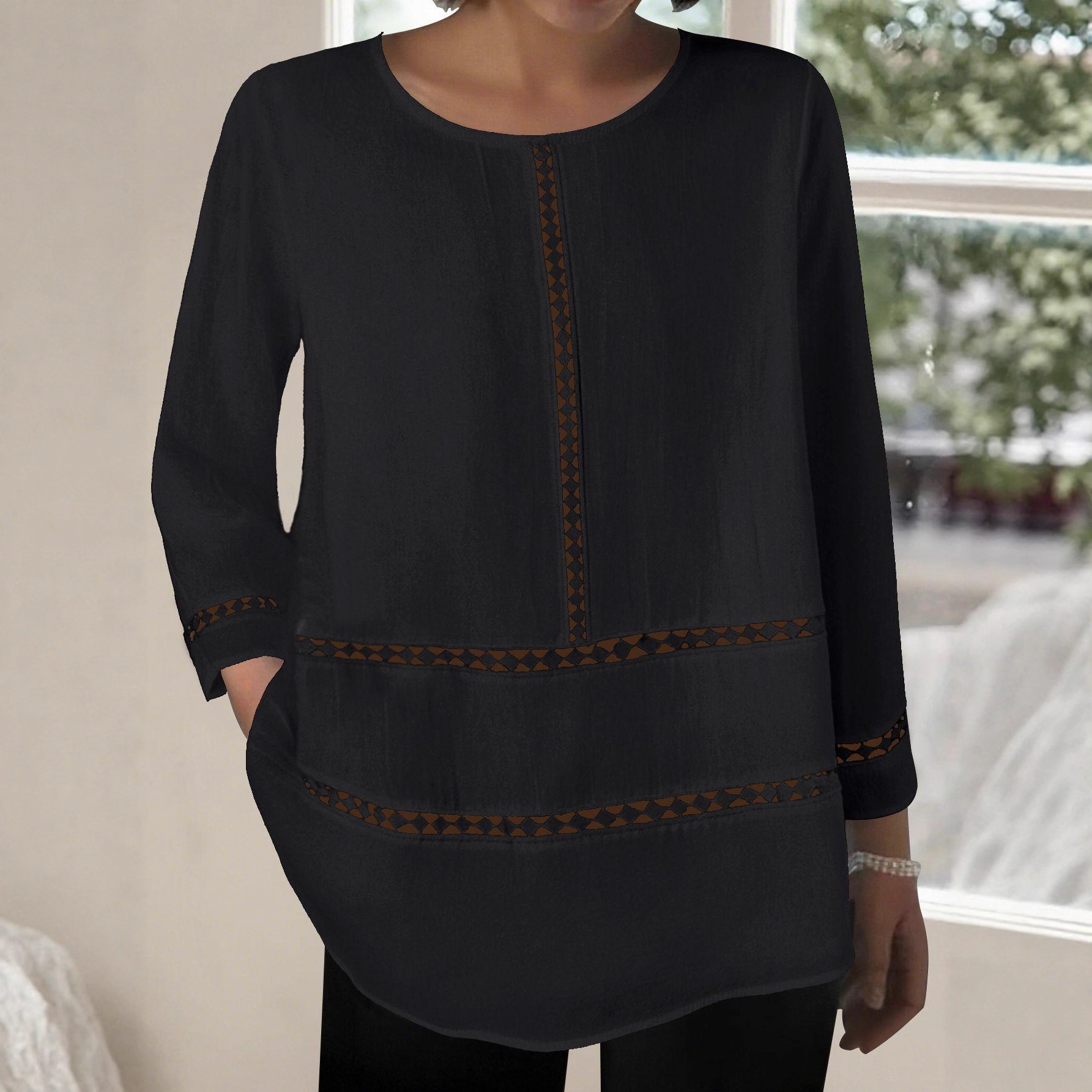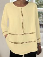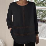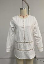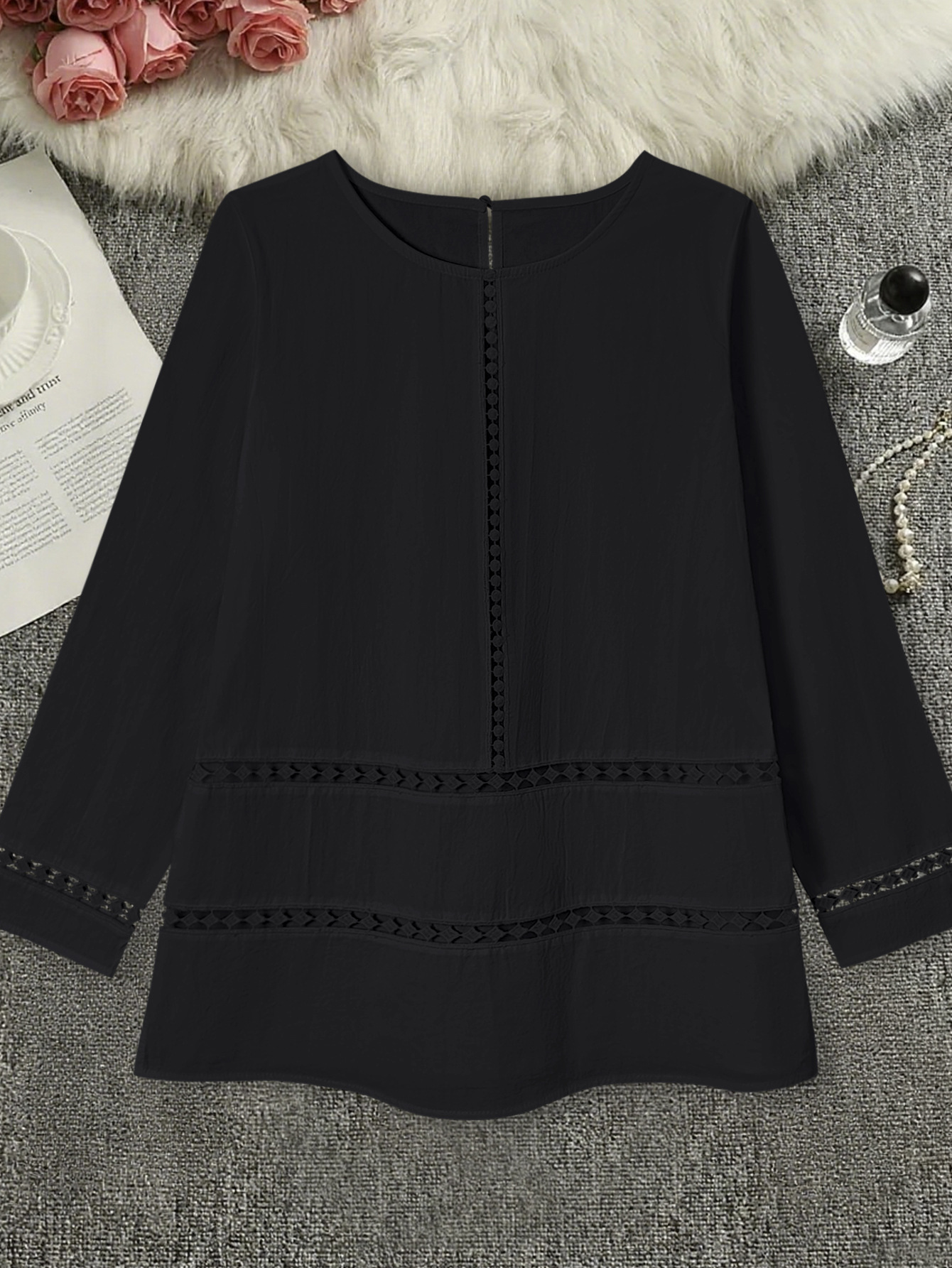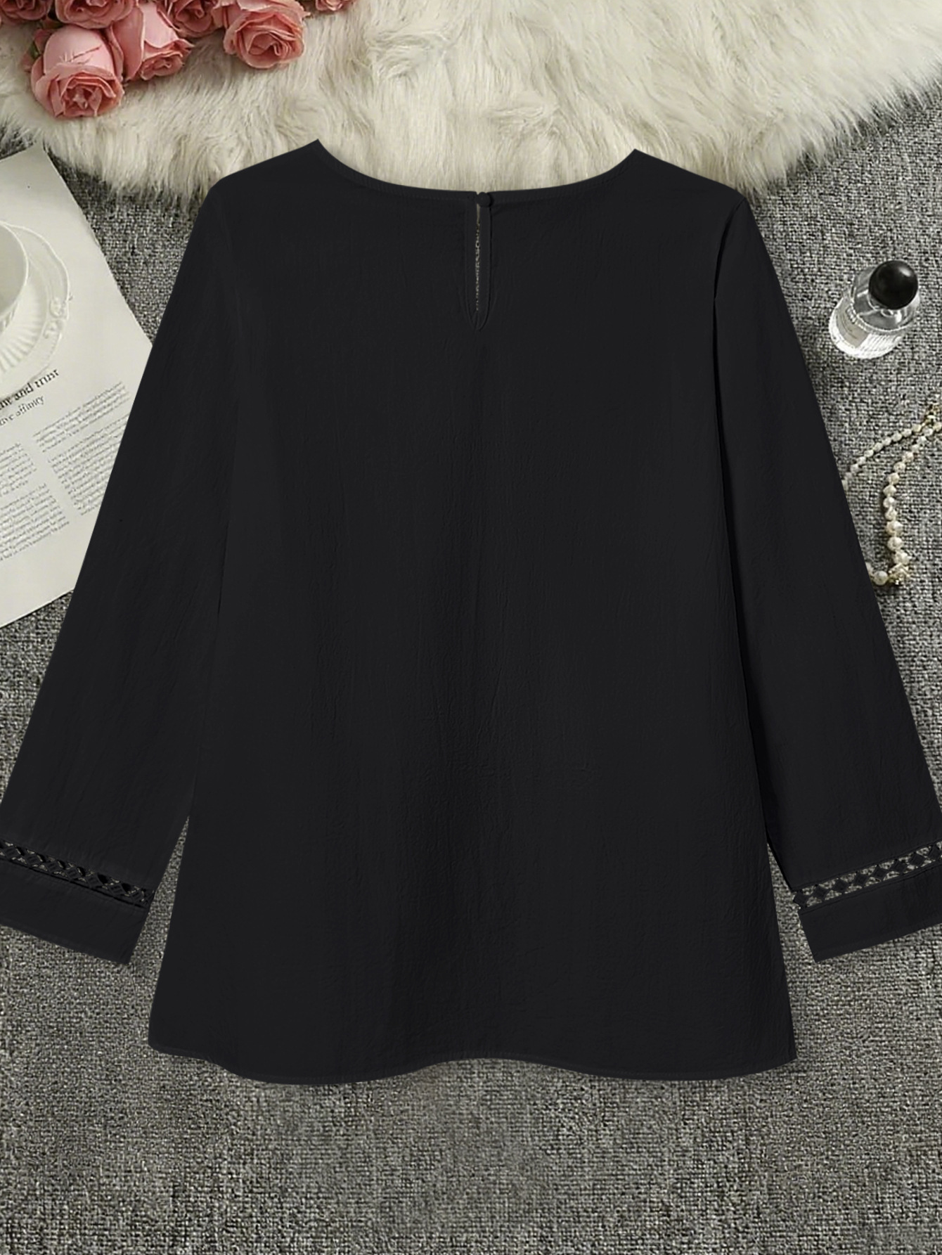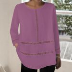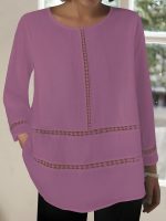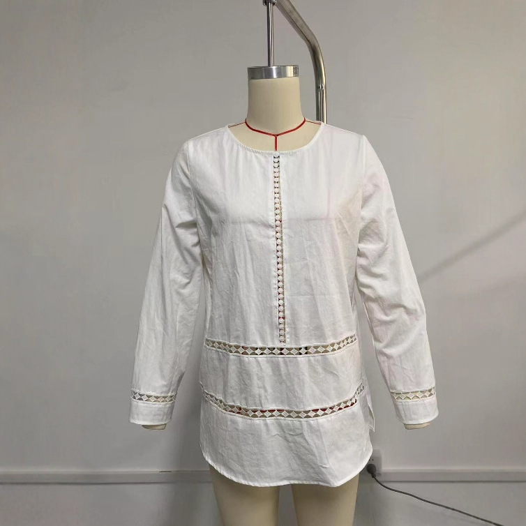 Elegant women’s round-neck long-sleeve shirt with semi-sheer hollow-out design for a stylish, breathable look suitable for diverse occasions.