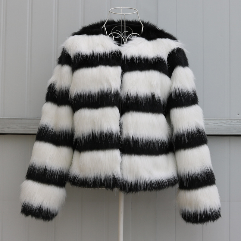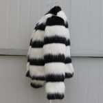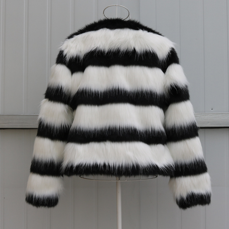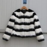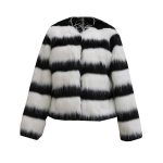 Stylish black and white striped long-sleeve leather jacket designed for warmth and fashion.