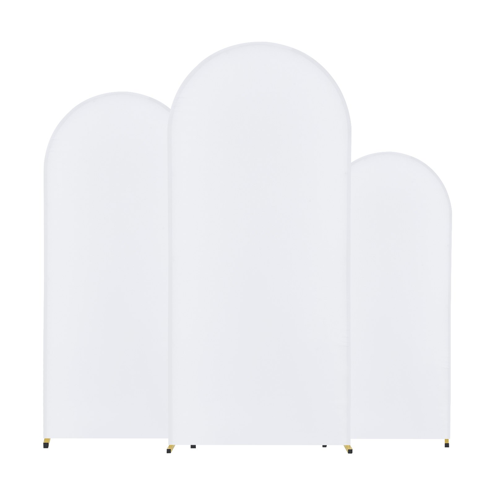 This set of three wedding arch backdrop stands features a durable gold metal frame designed for stability and ease of assembly. Equipped with a chassis crossbar and case connection system, the structure ensures secure setup and reliable support. Each stand includes premium gauze fabric, offering an elegant aesthetic ideal for weddings, birthdays, holidays, and other special occasions. The portable design allows for convenient transportation and storage, making it suitable for various celebration settings.