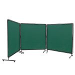 This professional welding screen features three panels measuring 182.9 cm by 182.9 cm each, constructed with flame-resistant vinyl for maximum protection against sparks and heat. Mounted on a robust frame, the screen is equipped with 12 swivel wheels, six of which are lockable to ensure stability during use. This moveable welding curtain is designed to provide a flexible and safe barrier for any workshop environment, allowing easy repositioning while maintaining durable shielding from welding hazards.