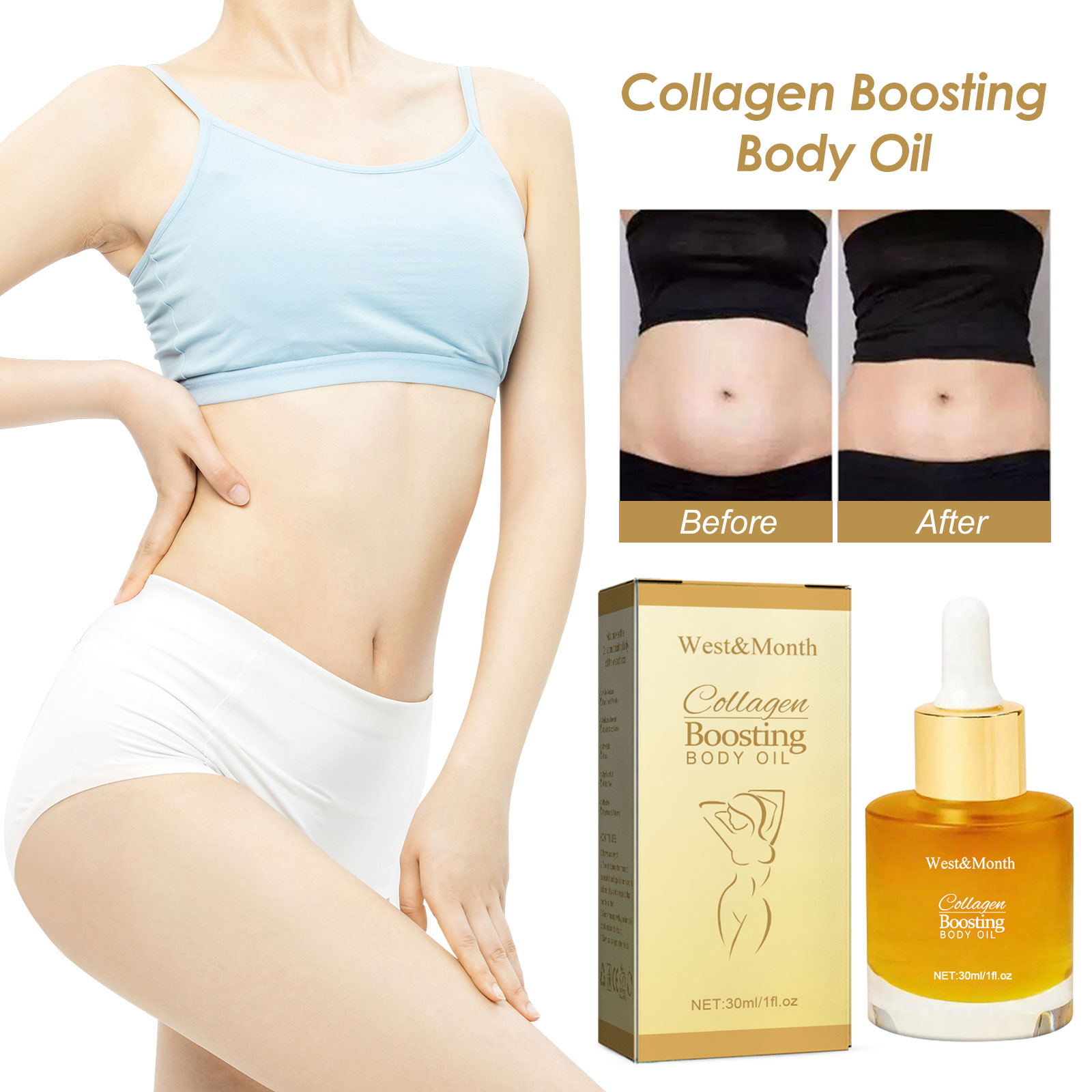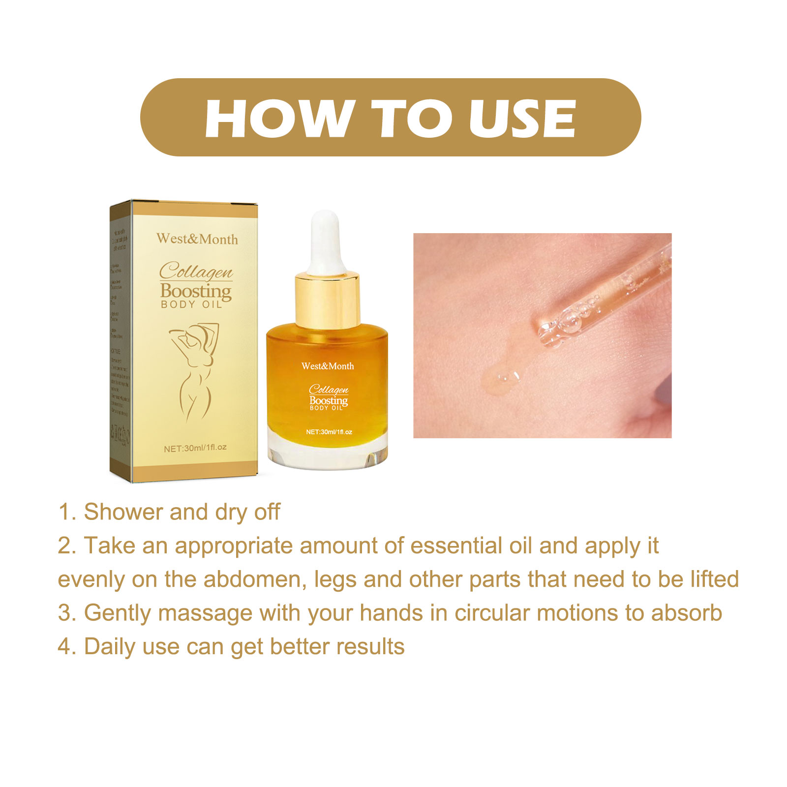 West&Month Collagen Boosts Body Essential Oils are formulated to enhance skin firmness and elasticity, specifically targeting the tummy and arms. This moisturizing slimming oil supports collagen production, helping to improve skin texture and promote a smoother, toned appearance. It absorbs quickly, delivering hydration and nourishment to maintain skin health while assisting in body contouring. Suitable for daily use, the oil combines beneficial ingredients aimed at revitalizing and firming the skin.