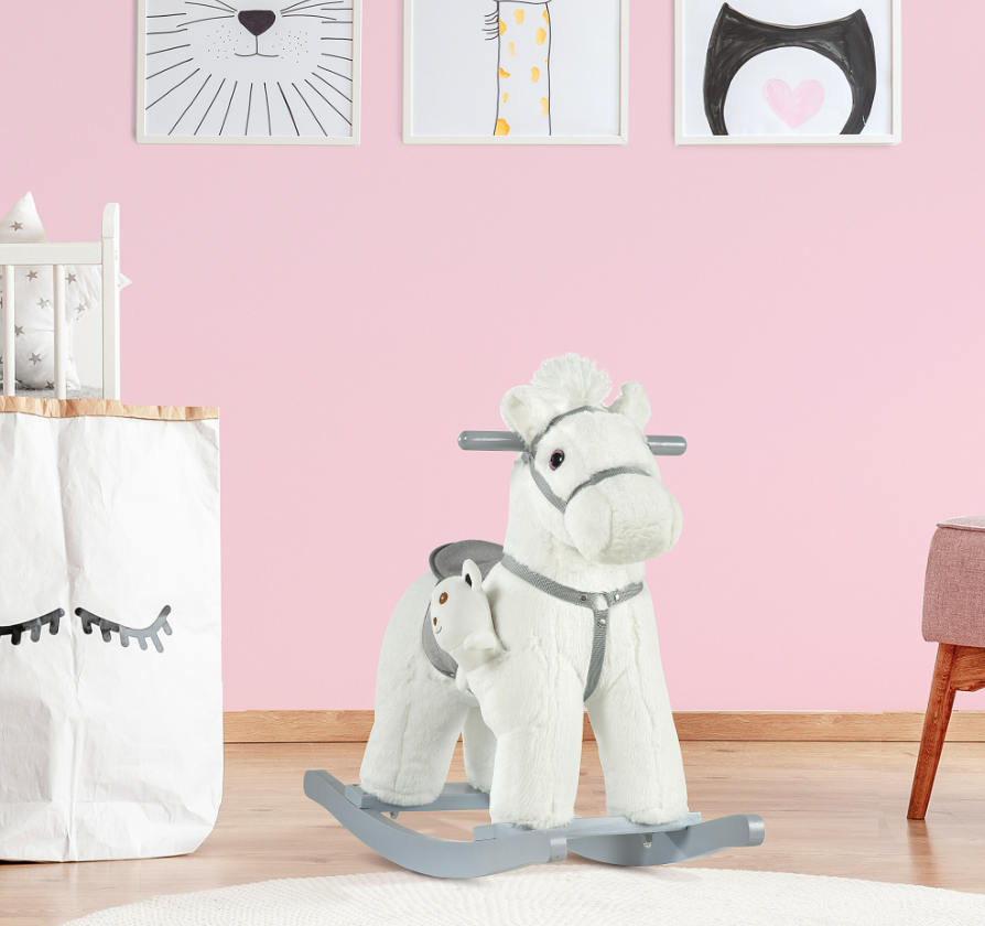 This white plush rocking horse is a delightful toy designed for children, featuring an attached bear for added charm. Crafted with soft materials, it provides comfort and safety during playtime. The rocker is equipped with gentle sound effects to enhance the interactive experience. Its sturdy construction ensures stability, making it ideal for use in nurseries and play areas. This plush rocking horse combines entertainment and comfort, offering a cozy and engaging activity for young children.