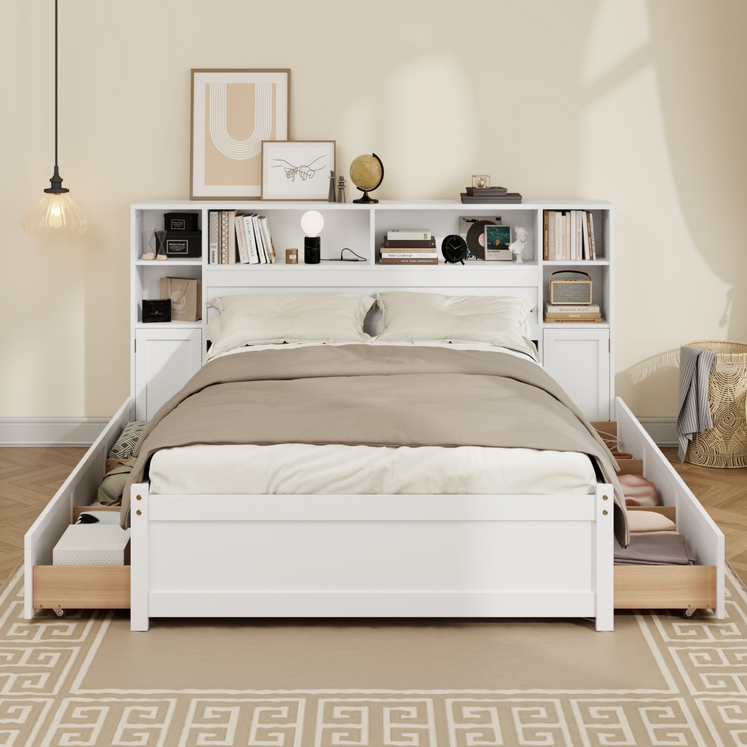 This white wooden twin storage bed combines practicality and style with a tall extended bookcase headboard designed for ample storage and display. It includes six spacious drawers beneath the frame, offering significant storage capacity ideal for bedrooms with limited space. Integrated into the headboard is a convenient charging station, providing easy access to power for electronic devices. Engineered to eliminate the need for a box spring, this sturdy bed frame supports the mattress directly for enhanced durability and comfort. Suitable for both teens and adults, this storage bed is an efficient solution that maximizes bedroom functionality while maintaining a clean, modern aesthetic.