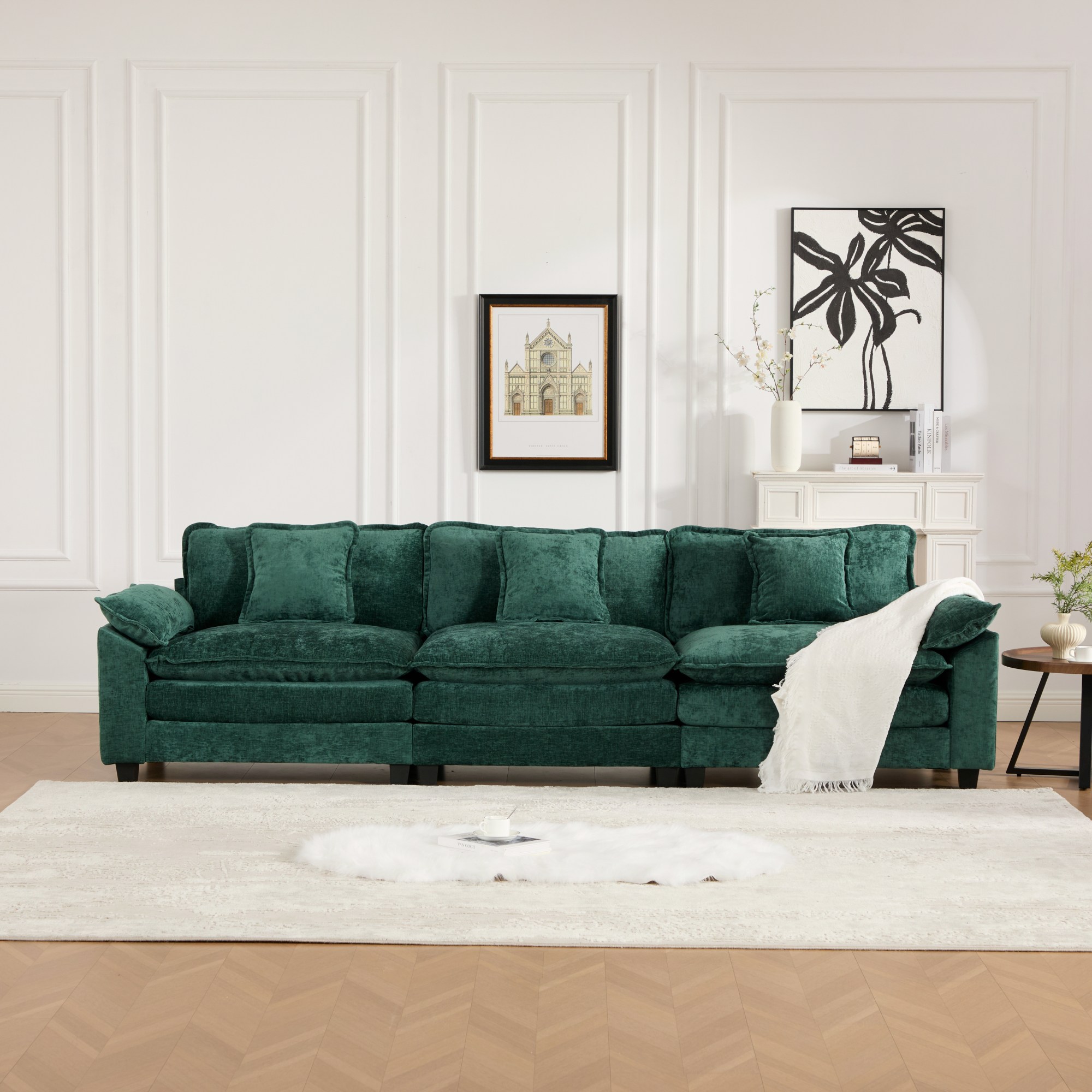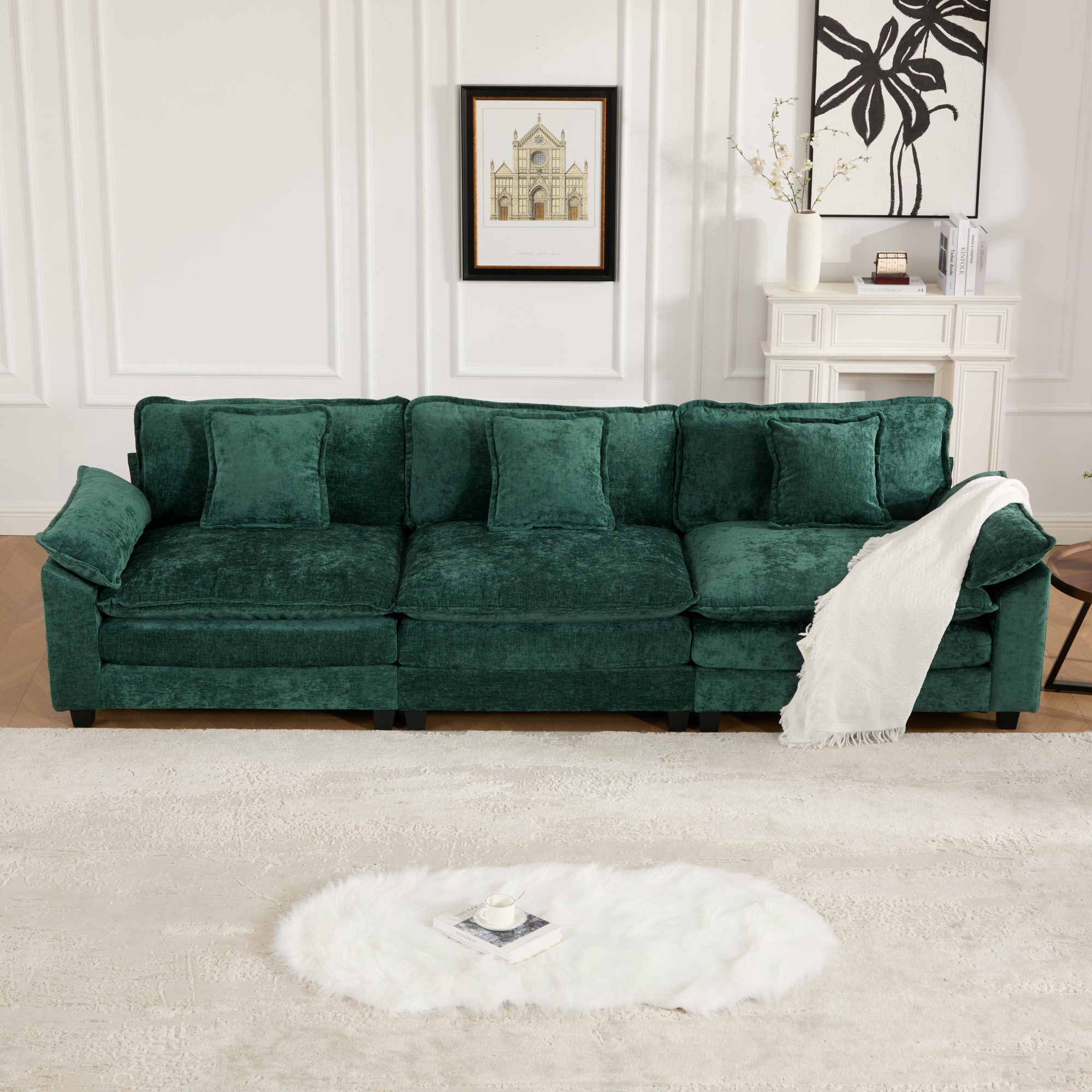 This modern sectional sofa features three seats with wider armrests for enhanced comfort. The ottoman is not included. Upholstered in breathable green chenille fabric, it offers a soft and durable surface. The double-layer seat cushions provide extra support and relaxation. Designed to fit seamlessly into living rooms, bedrooms, or apartments, this sofa combines style and functionality with its contemporary design and high-quality materials.
