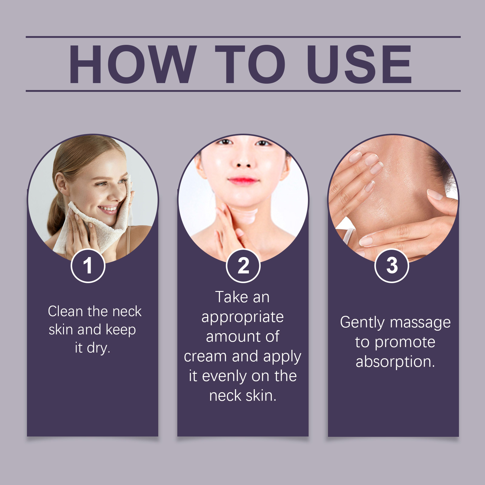 Our neck cream contains glycerin, nicotinamide and Asiaticum extract. It can effectively lighten the skin tone of the neck, reduce dullness, and present a natural glow. The way to use it is simple: 1. Clean the skin on the neck and keep it dry. 2. Apply proper amount of face cream to neck skin evenly. 3. Massage gently to promote absorption. Helps fade dark spots and blemishes, and improves evenness of neck skin.