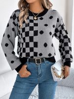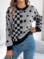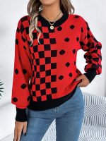 Stylish women’s pullover sweater featuring color block, polka dot, and plaid patterns with lantern sleeves for casual wear.